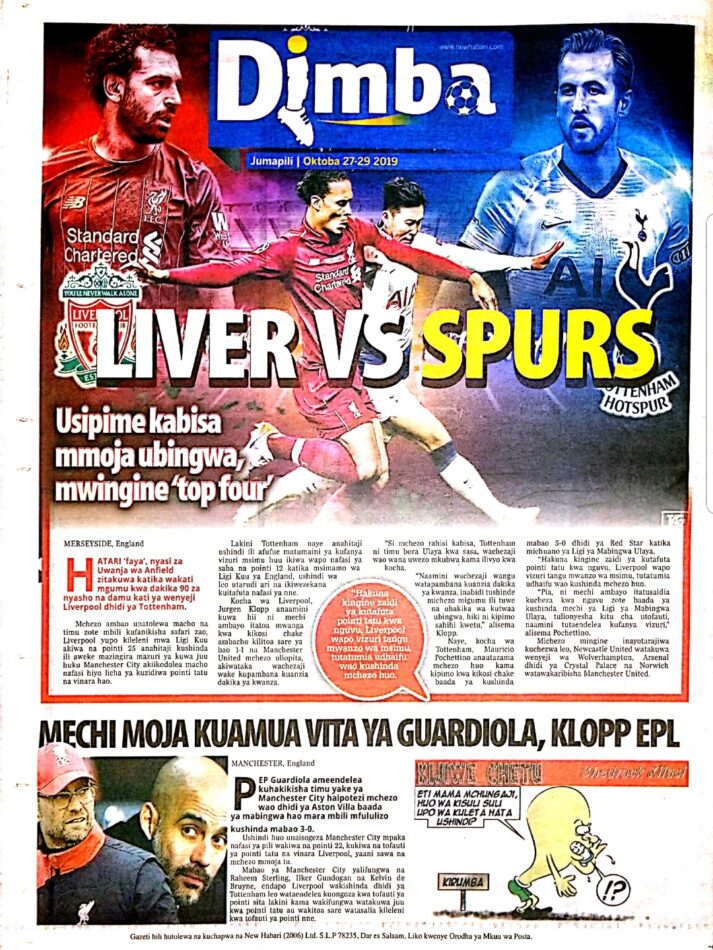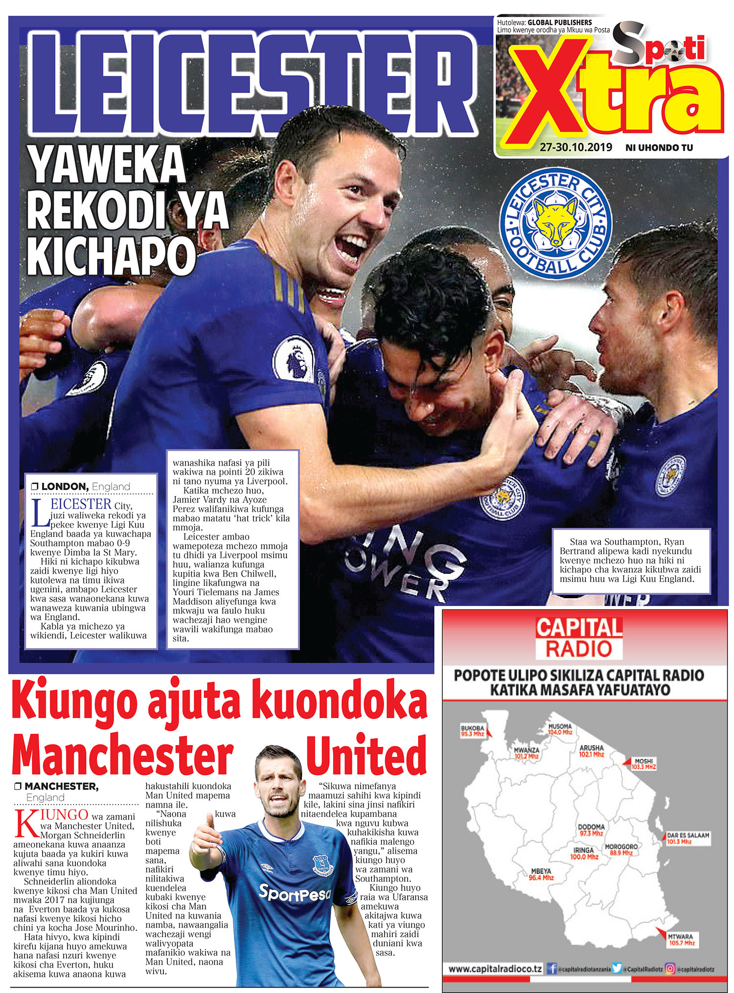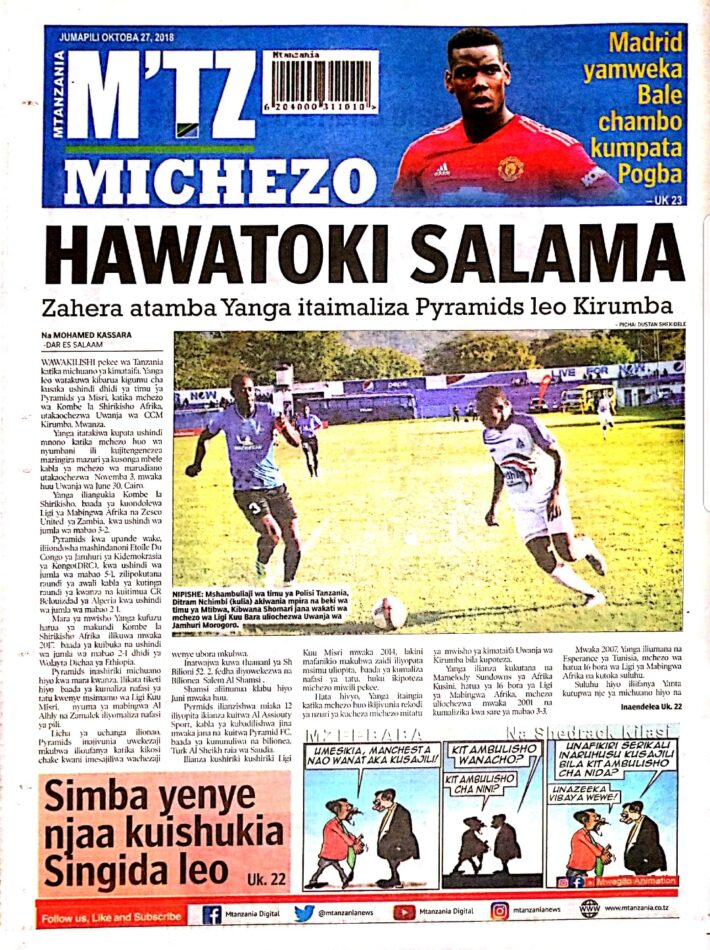 Magazeti ya Tanzania Leo Jumapili, Oktoba 27, 2019 Global Publishers October 27, 2019 SHARE THIS: Hapa tumekuanikia kurasa za mbele na za nyuma za magazeti yote ya Tanzania leo Oktoba 27, 2019. Ni yale ya Hardnews, Udaku na Michezo. Usipitwe na Matukio, Install App Yako ya Kijanja na Namba Moja Tanzania ya Global Publishers Android ===> GooglePlay iOS ===> AppStore SHARE THIS: