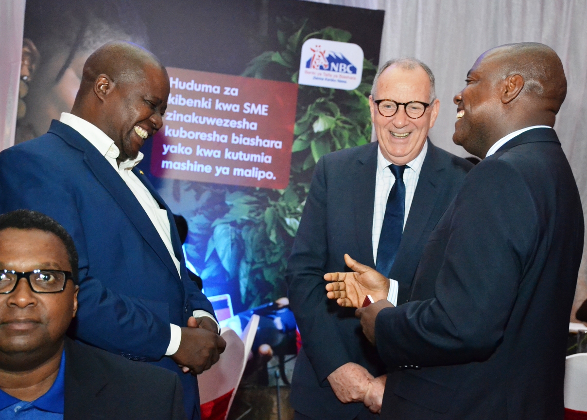 Mkurugenzi Mtendaji wa Benki ya NBC, Theobald Sabi (kushoto), akisalimiana na Mkurugenzi wa Fedha wa Chuo Kikuu cha Afya na Sayansi Shirikishi Muhimbili (MUHAS), Abdallah Mwaduga katika hafla waliyowaandalia wateja wao jijini Dar es Salaam ikiwa ni sehemu ya kutoa shukurani kwa mahusiano bora ya kibiashara kati ya NBC na wateja hao kwa mwaka 2019. Hafla hiyo ilifanyika jijini Dar es Salaam juzi. Katikati ni Ofisa katika kitengo cha wateja binafsi wa NBC, Rehema Chonde.…Theobald Sabi (kulia), akifurahi pamoja na baadhi ya wateja wa benki hiyo katika hafla waliyowaandalia wateja wao jijini Dar es Salaam ikiwa ni sehemu ya kutoa shukurani kwa mahusiano bora ya kibiashara kati ya NBC na wateja hao kwa mwaka 2019. Hafla hiyo ilifanyika jijini Dar es Salaam juzi. Kutoka Kushoto ni Mkuu wa Kampuni G4S Cash Solutions Tanzania, Hassan Nuru na Mkurugenzi Mtendaji wa Kampuni ya G4S Secure Solutions Tanzania, Barry Hogg.…Theobald Sabi (kushoto), akisalimia na Mkurugenzi wa Kampuni ya Enterprises Business Department, Tony Wu huku Ofisa Fedha Mkuu wa Kampuni ya Huawei Technologies Tanzania, Mao Jinbao akiangalia katika hafla waliyowaandalia wateja wao jijini Dar es Salaam ikiwa ni sehemu ya kutoa shukurani kwa mahusiano bora.Mjumbe wa Bodi ya Wakurugenzi ya Benki ya NBC, Dk. Kassim Hussein (kulia), akisalimiana na baadhi ya wateja waliohudhuria hafla waliyowaandalia wateja wao jijini Dar es Salaam ikiwa ni sehemu ya kutoa shukurani kwa mahusiano bora ya kibiashara kati ya NBC na wateja hao kwa mwaka 2019Mkurugenzi wa Wateja wa Makampuni wa Benki ya NBC, Linley Kapya (kushoto), akisalimiana na Mkurugenzi wa Fedha wa Chuo Kikuu cha Afya na Sayansi Shirikishi Muhimbili (MUHAS), Abdallah Mwaduga katika hafla hiyo.Mjumbe wa Bodi ya Wakurugenzi wa Benki ya NBC, Dk. Kassim Hussein (kushoto), akisalimiana na Mkurugenzi Mkuu Mamlaka ya Anga Tanzania, Hamza Johari, huku Meneja Mahusiano wa NBC, William Kallaghe (katikati), akiangalia, katika hafla waliyowaandalia wateja wao jijini Dar es Salaam ikiwa ni sehemu ya kutoa shukurani kwa mahusiano bora ya kibiashara kati ya NBC na wateja hao kwa mwaka 2019.Mkurugenzi wa Biashara wa Benki ya NBC, Elvis ndunguru (katikati), akizungumza jambo na Mkurugenzi Mtendaji wa benki hiyo, Theobald Sabi (kushoto), huku Mwenyekiti wa Kampuni ya Chelsea Starway Group, Martin Mbwana akisikiliza, katika hafla waliyowaandalia wateja wao jijini Dar es Salaam ikiwa ni sehemu ya kutoa shukurani kwa mahusiano bora ya kibiashara kati ya NBC na wateja hao kwa mwaka 2019.