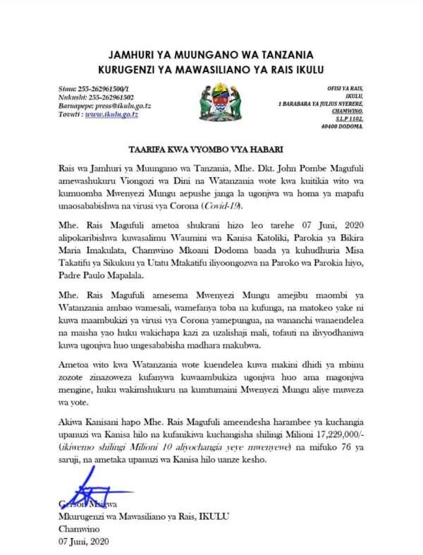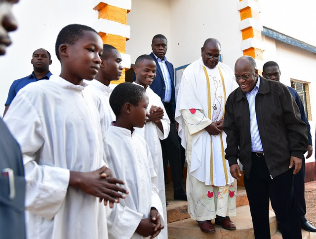 Rais Magufuli leo Juni 7, 2020 amewashukuru Viongozi wa Dini na Watanzania wote kwa kuitikia wito wa kumuomba Mwenyezi Mungu aepushe janga la ugonjwa wa homa ya mapafu unaosababishwa na virusi vya Corona (Covid-19) akiwa Kanisa Katoliki Parokia ya Mtakatifu Bikira Maria Imaculata Chamwino Ikulu mkoani Dodoma.