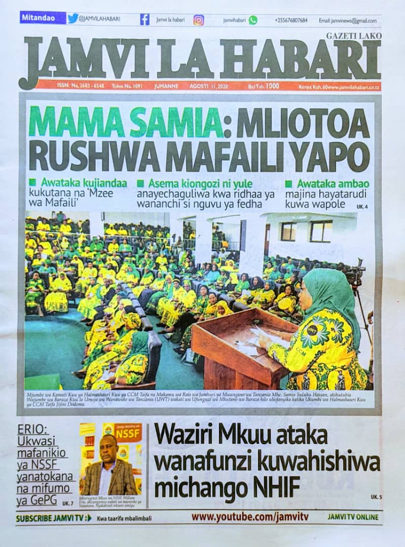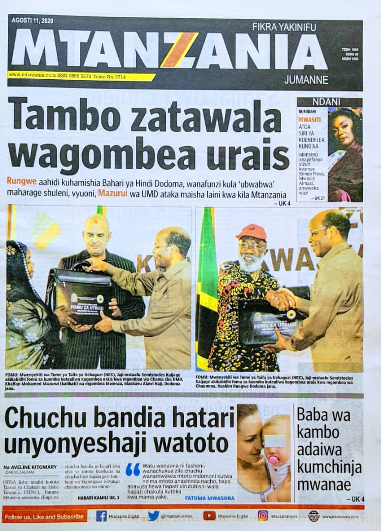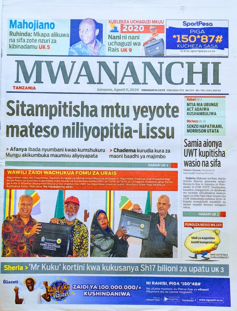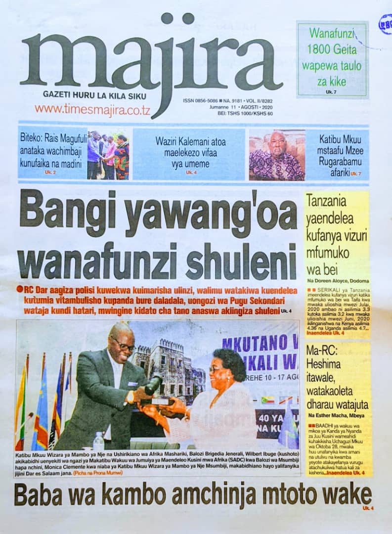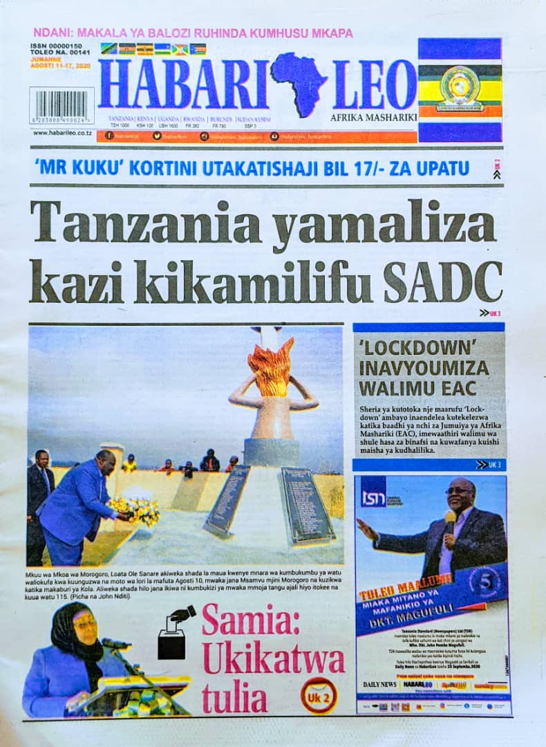 Soma Magazeti ya Tanzania Leo Jumanne, Agosti 11, 2020 Global Publishers August 11, 2020 0 Comments SHARE THIS: Hapa tumekuanikia kurasa za mbele na za nyuma za magazeti yote ya Tanzania leo Agosti 11, 2020 Usipitwe na Matukio, Install App Yako ya Kijanja na Namba Moja Tanzania ya Global Publishers Android ===> GooglePlay iOS ===> AppStore SHARE THIS:
