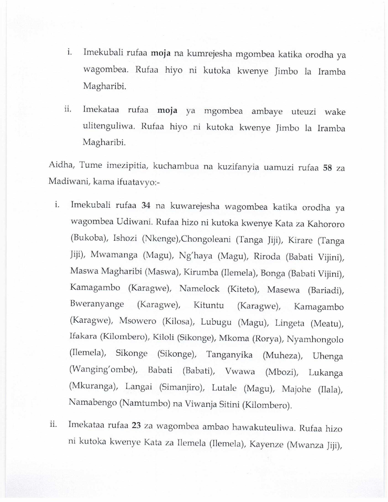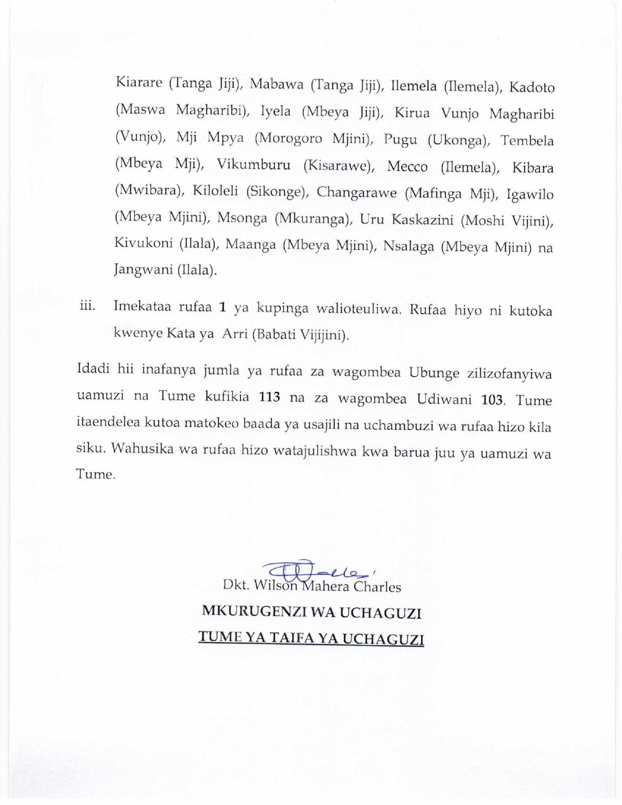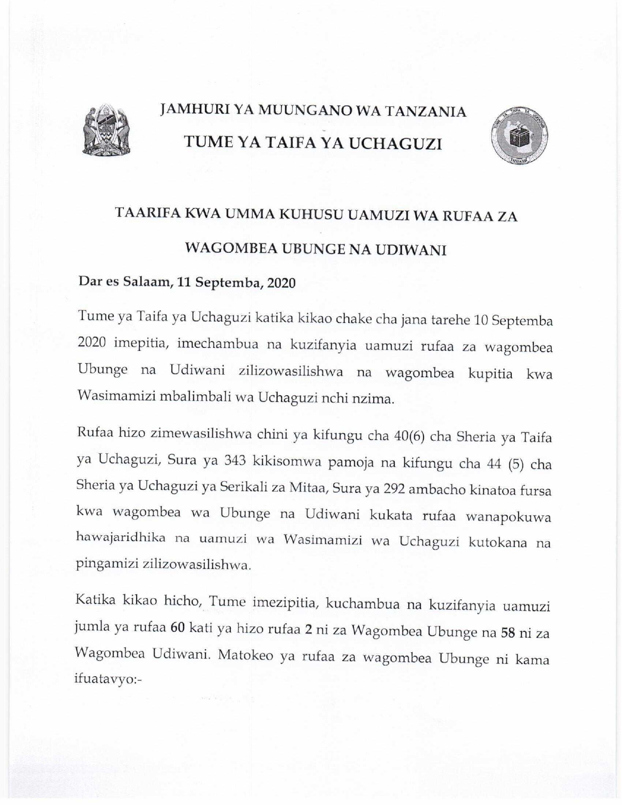 Tume ya Taifa Uchaguzi imepitia, kuzichambua na kuzifanyia uamuzi rufaa za wagombea Ubunge na Udiwani zilizowasilishwa na wagombea kupitia kwa Wasimamizi mbalimbali wa Uchaguzi nchi nzima.