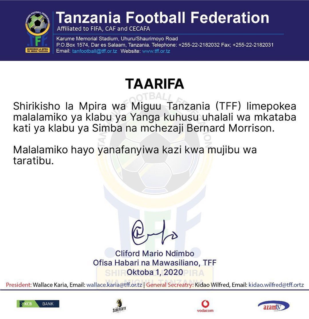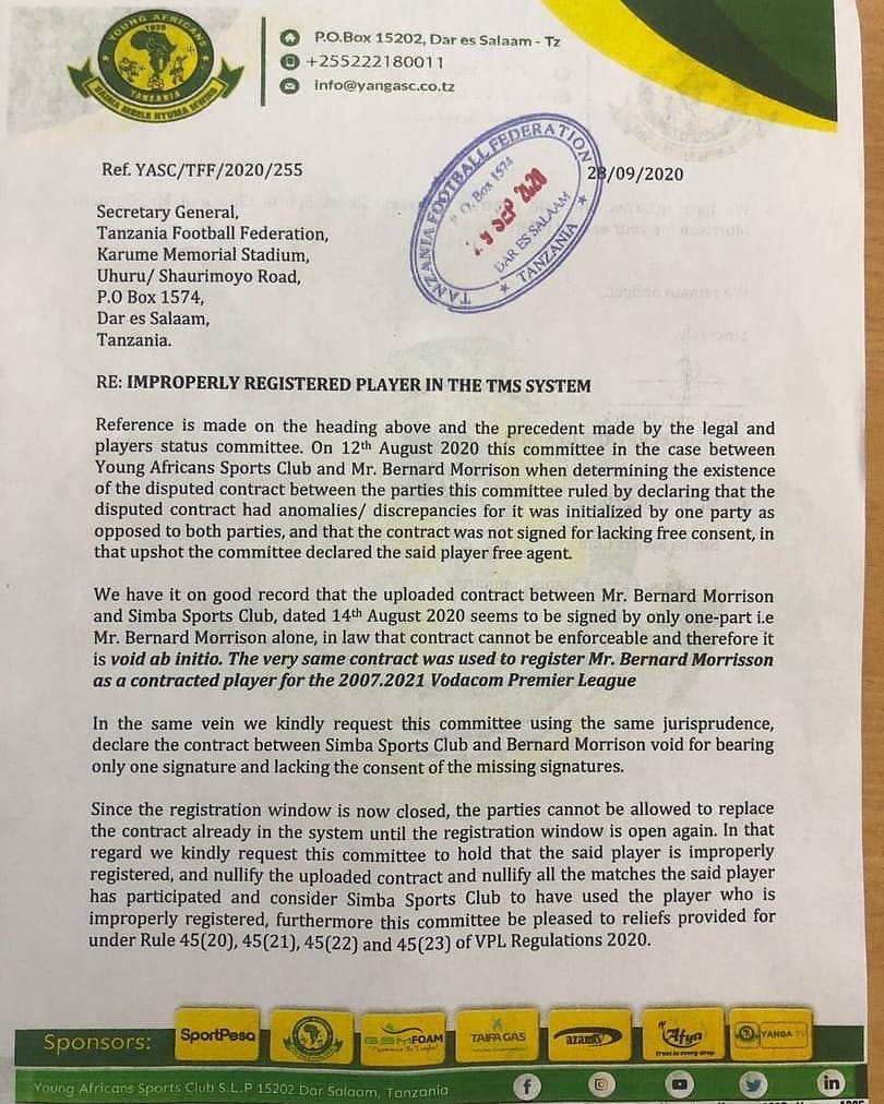 Shirikisho la Mpira wa Miguu Tanzania (TFF) limepokea malalamiko ya klabu ya Yanga kuhusu uhalali wa mkataba kati ya klabu ya Simba na mchezaji Berard Morrison.