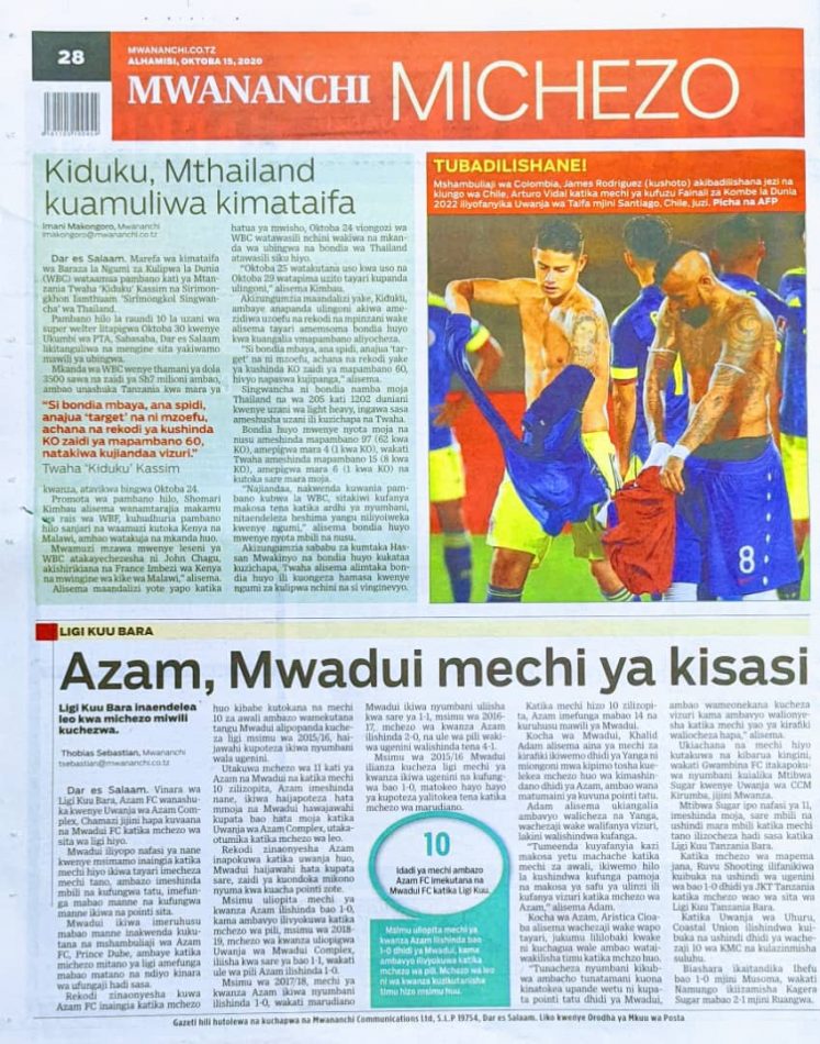Soma Magazeti ya Tanzania Leo Oktoba 15, 2020 Global Publishers October 15, 2020 0 Comments SHARE THIS: Hapa tumekuanikia kurasa za mbele na za nyuma za magazeti yote ya Tanzania leo Oktoba 15, 2020 Usipitwe na Matukio, Install App Yako ya Kijanja na Namba Moja Tanzania ya Global Publishers Android ===> GooglePlay iOS ===> AppStore SHARE THIS: