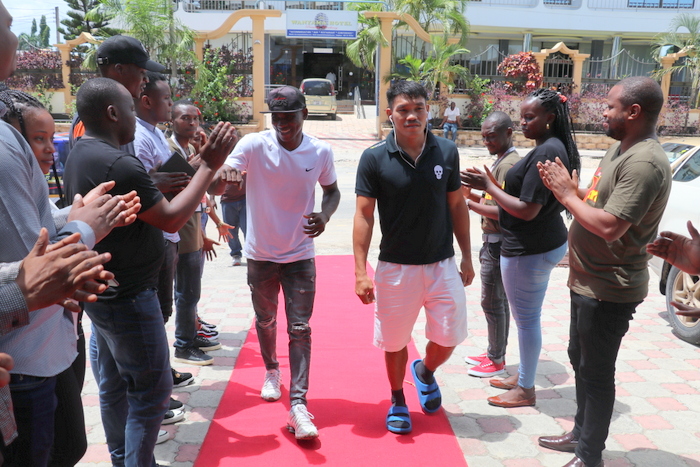 Bondia wa Tanzania, Idd Pialali (kushoto) akiongozana na bondia mwenzake, Arnel Tinampay kutoka Ufilipino (kulia) wakiwasili katika ofisi za Global Group, Sinza Mori jijini Dar es Salaam leo kwa ajili ya utambulisho wa pambano lao watakalocheza Jumamosi, Novemba 28, 2020.