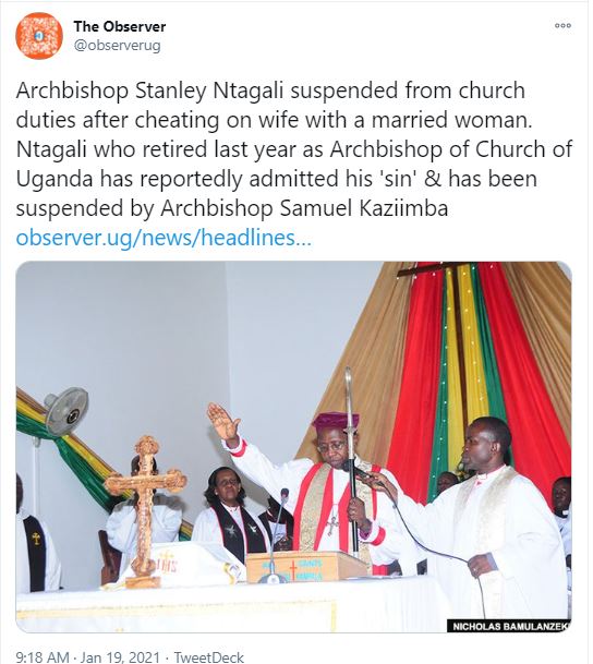 Ntagali ambaye alistaafu mwezi Machi mwaka jana 2020 baada ya kuhudumu kwa miaka 43 kama askofu, katika taarifa ya Januari 13 kwenye tovuti ya kanisa hilo, mrithi wake Dkt. Stephen Samuel Kaziimba, amesema Ntagali alijihusisha na mahusiano na mwanamke mmoja aliyekuwa kwenye ndoa na hilo alilifahamu.