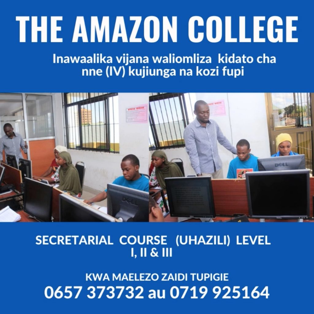 THE AMAZON COLLEGE inawaalika vijana wote waliomaliza kidato cha nne (IV) kujiunga na kozi Fupi za COMPUTER APPLICATION Katika kipindi hiki cha kusubiri matokeo yenu, Gharama zetu ni nafuu sana, pia chuo kinatoa kozi mbalimbali za Ajira kwa Gharama nafuu sana kama ifuatavyo.