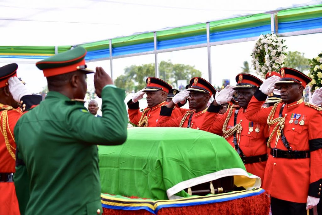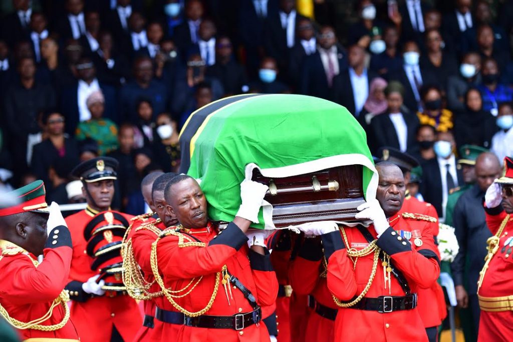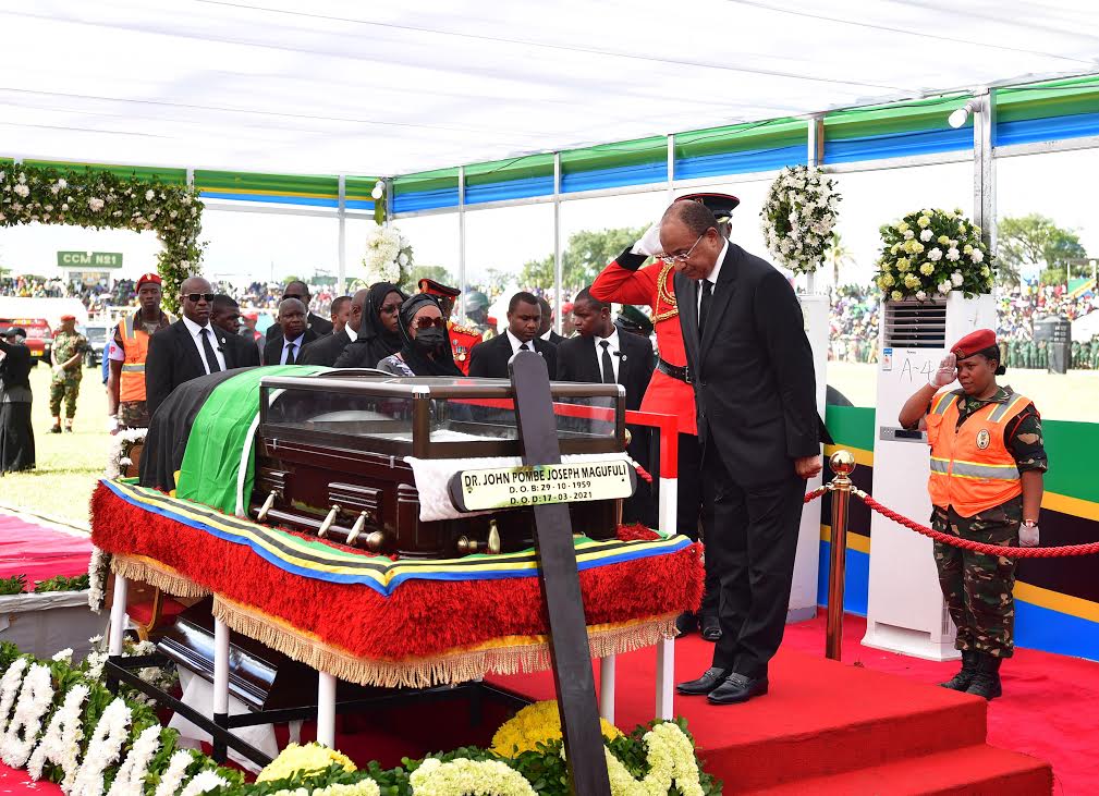 Rais wa Jamhuri ya Muungano wa Tanzania Mheshimiwa Samia Suluhu Hassan akitoa Heshima za Mwisho kwenye jeneza lenye mwili wa aliyekuwa Rais wa Jamhuri ya Muungano wa Tanzania katika Awamu ya tano Hayati Dkt. John Pombe Magufuli katika uwanja wa Jamhuri mkoani Dodoma