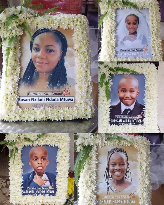 Waliofariki dunia ni Susan Mtuwa na watoto wake wawili, Nathan (6) na Natalia (5) pamoja na watoto wengine wawili Cris (11) na Michelle (8) ambao ni watoto wa shemeji zake Susan huku dada wa kazi wa familia hiyo aliyekwenda pamoja nao uwanjani hapo.