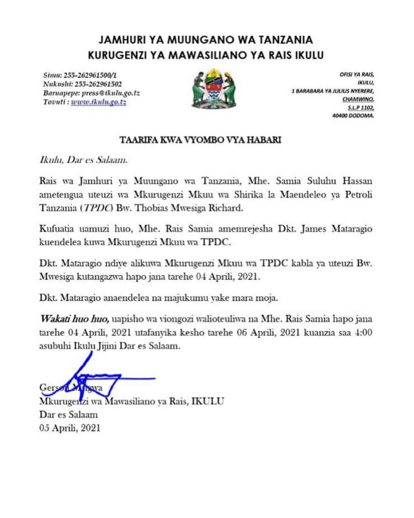RAIS wa Jamhuri ya Muungano wa Tanzania ametengua uteuzi wa Thobias Mwesiga Richard kuwa Mkurugenzi mpya wa Shirika la Maendeleo ya Petroli, Dkt. James Mataragio aliyekuwa Mkurugenzi Mkuu wa Shirika hilo ataendelea na majukumu yake.