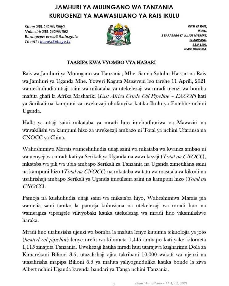 Rais Samia ametoa kauli hiyo wakati wa hotuba yake mbele ya wadau wa mradi huo ikiwa ni saa chache kabla ya kusainiwa mkataba wa utatu, unaohusisha kuanza upande wa Serikali na Kampuni ili kuanza ujenzi wa bomba hilo la kilometa 1,445.