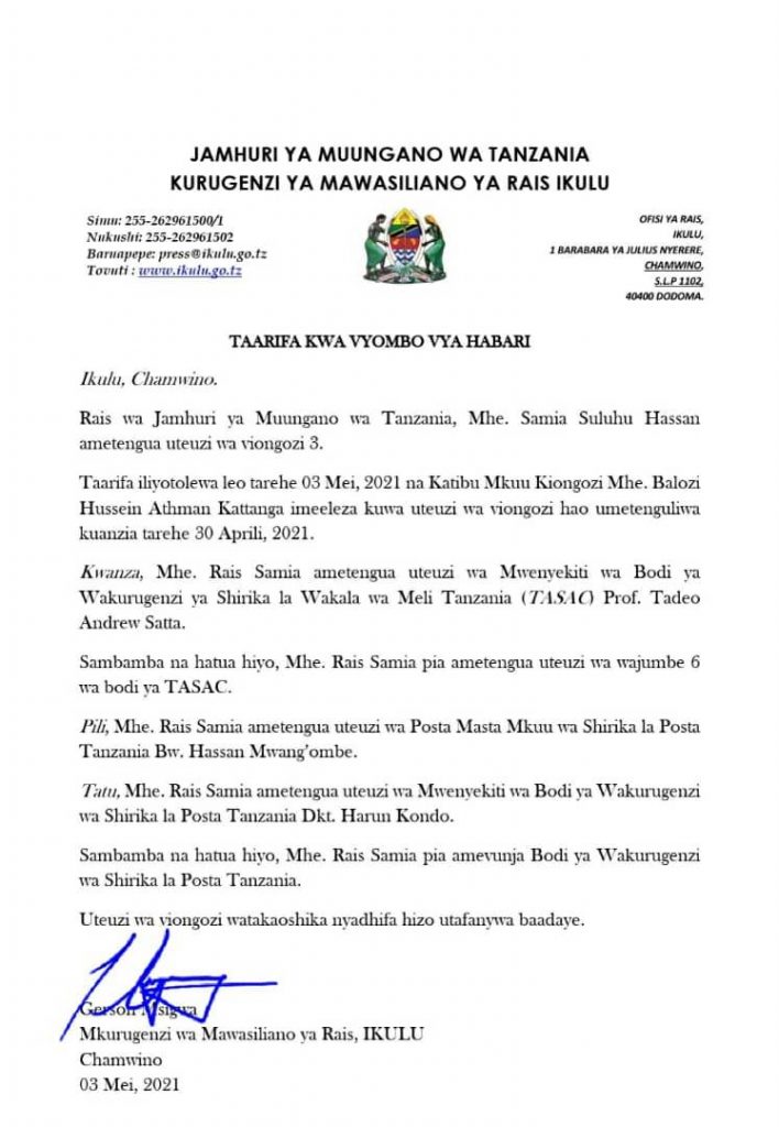 Rais Samia Suluhu Hassan, ametengua uteuzi wa viongozi watatu akiwemo Mwenyekiti wa Bodi ya Wakurugenzi wa Shirika la Wakala wa Meli Tanzania (TASAC), Profesa Tadeo Satta, Posta Masta Mkuu wa Shirika la Posta Tanzania, Hassan Mwang’ombe na Mwenyekiti wa Bodi ya Wakurugenzi wa Posta, Harun Kondo.