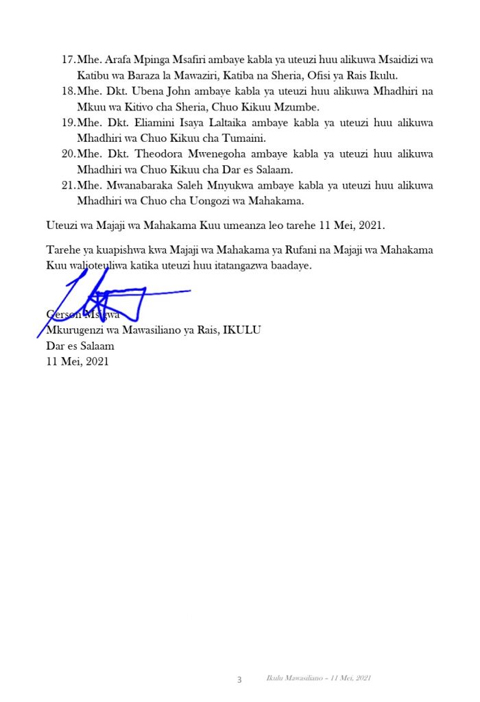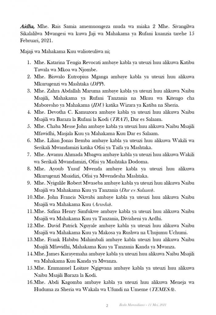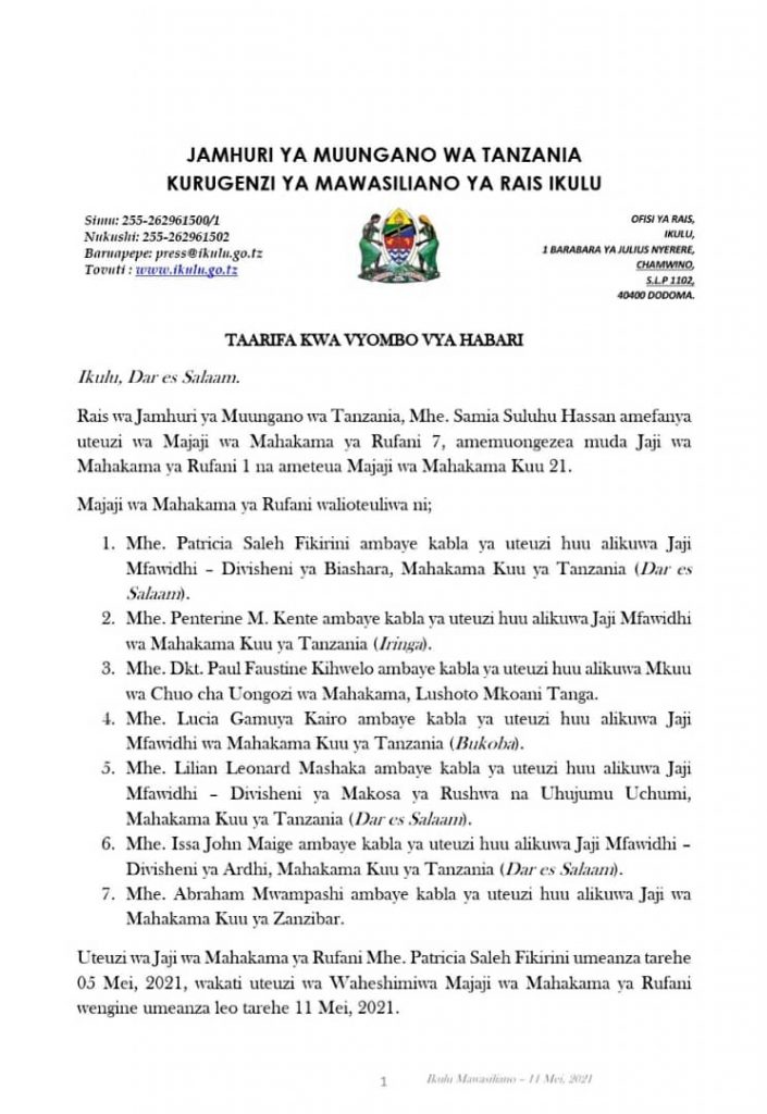 Rais wa Tanzania, Samia Suluhu Hassan Samia Suluhu Hassan leo Jumanne, Mei 11, 2021 amefanya uteuzi wa Majaji 7 wa Mahakama za Rufani na amemuongezea muda Jaji mmoja, pia ameteua Majaji 21 wa Mahakama Kuu.