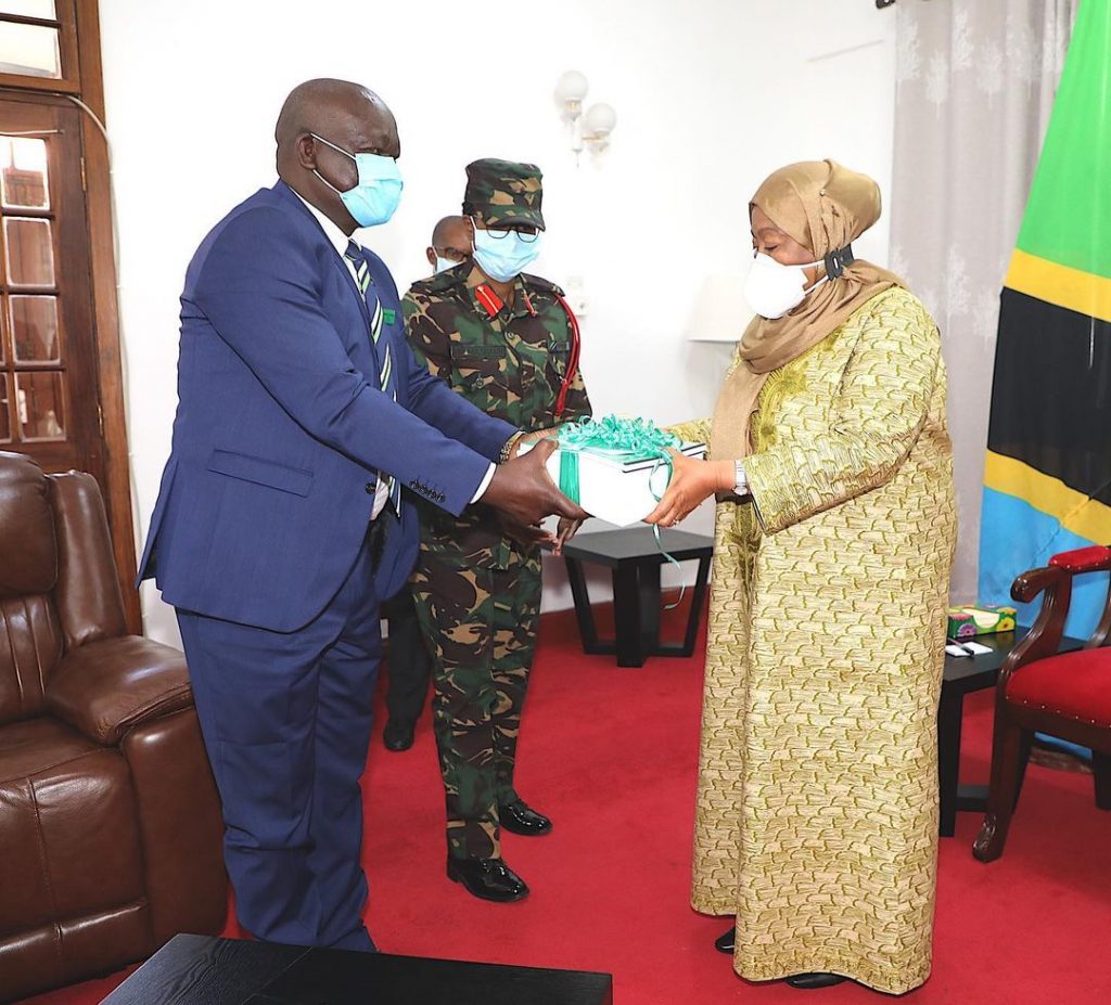 Rais wa Jamhuri ya Muungano wa Tanzania, Samia Suluhu Hassan, akipokea Taarifa ya Ukaguzi Maalum inayohusu matumizi ya Fedha zilizotolewa Benki Kuu ya Tanzania (BOT) kati ya mwezi Januari na Machi mwaka huu, kutoka kwa Mdhibiti na Mkaguzi Mkuu wa Hesabu za Serikali (CAG), Charles Kichere Jijini Dodoma leo tarehe 01 Julai, 2021.