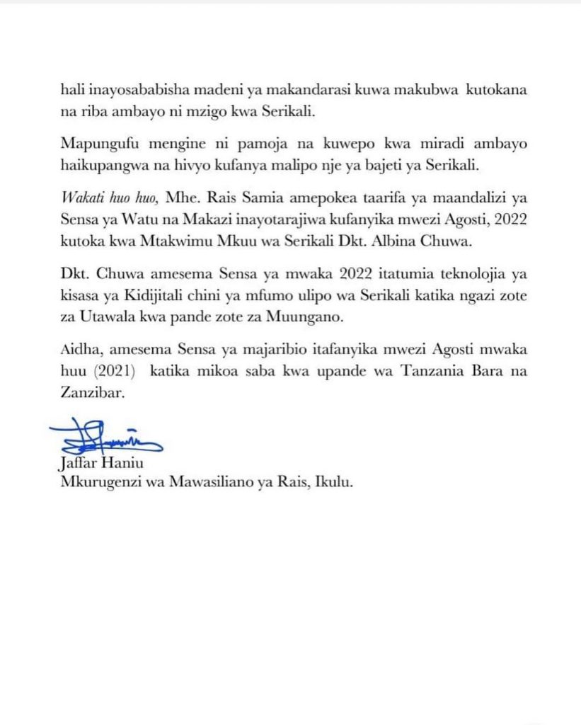 Pia amepokea Taarifa ya maandalizi ya Sensa ya Watu na Makazi, inayotarajiwa kufanyika mwezi Agosti mwaka 2022, kutoka kwa Mtakwimu Mkuu wa Serikali Dkt. Albina Chuwa.