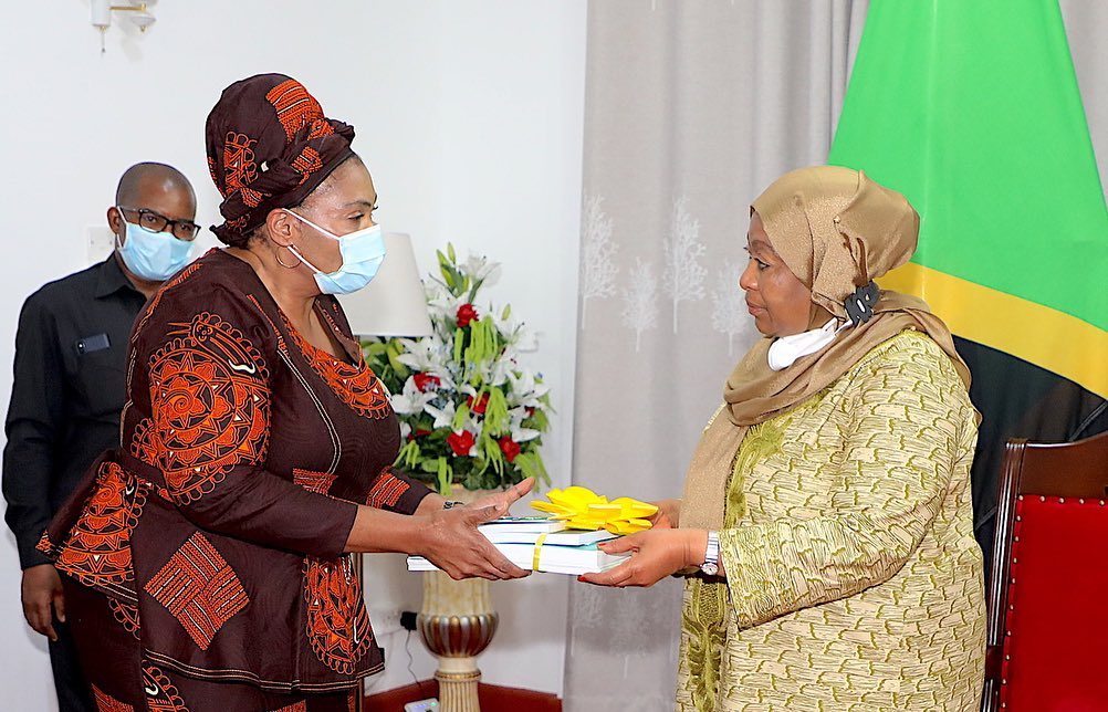 Rais Samia (kulia) akipokea Taarifa ya maandalizi ya Sensa ya Watu na Makazi, inayotarajiwa kufanyika mwezi Agosti mwaka 2022, kutoka kwa Mtakwimu Mkuu wa Serikali Dkt. Albina Chuwa, leo 01 Julai, 2021 Jijini Dodoma.
