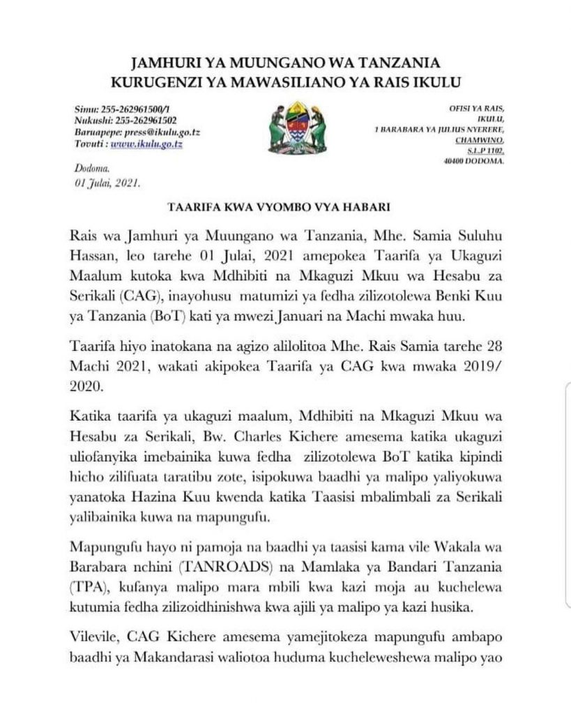 Rais Samia leo 01 Julai, 2021 Jijini Dodoma amepokea Taarifa ya Ukaguzi Maalum kutoka kwa Mdhibiti na Mkaguzi Mkuu wa Hesabu za Serikali-CAG inayohusu matumizi ya fedha zilizotolewa Benki Kuu ya Tanzania (BOT)kati ya Mwezi Januari mpaka Machi Mwaka Huu