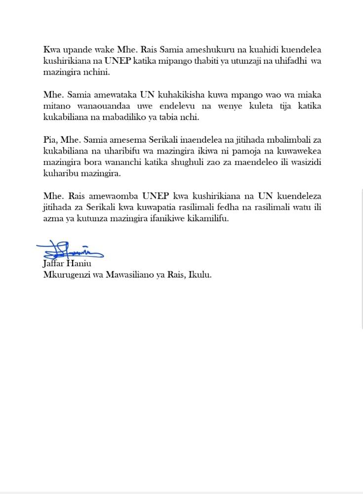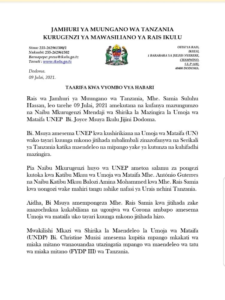 Rais Samia Akutana na Mtendaji wa UNEP – Video Global Publishers July 9, 2021 0 Comments SHARE THIS: Rais wa Jamhuri ya Muungano wa Tanzania Samia Suluhu Hassan, amekutana na kuzungumza na Naibu Mkurugenzi Mtendaji wa Shirika la Mazingira la Umoja wa Mataifa (UNEP), Bi. Joyce Msuya na ujumbe wake Ikulu Jijini Dodoma leo. SHARE THIS: