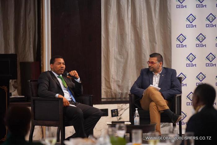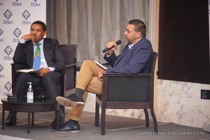 Mwenyekiti wa CEOrt, Sanjay Rughani akizungumza kwenye mkutano wa wajumbe wa CEOrt ambao ni maofisa watendaji wakuu wa taasisi mbalimbali za sekta binafsi uliofanyika jijini Dar es Salaam ukiwa na lengo la kuona jinsi gani sekta binafsi zitashirikiana na mipango ya serikali ya maendeleo ya miaka mitano ijayo ya kukuza uchumi wa Taifa. Kushoto ni Waziri wa Fedha na Mipango, Mhe . Dkt Mwigulu Nchemba.