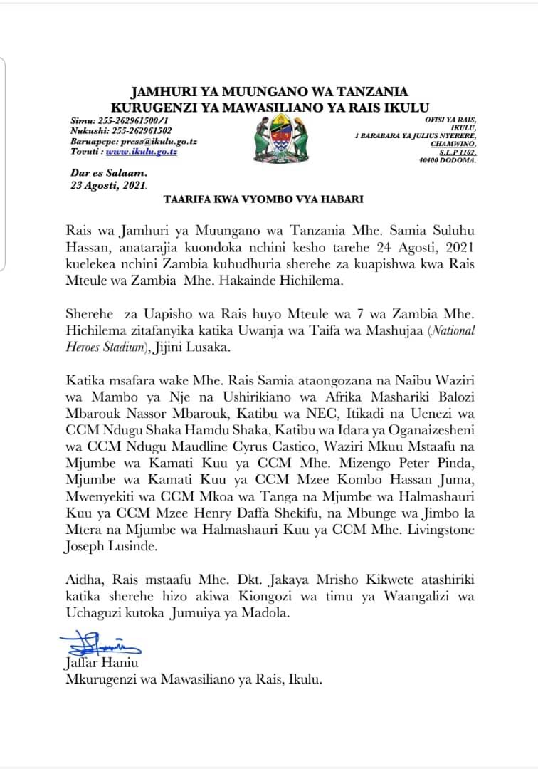 Rais wa Tanzania, Samia Suluhu Hassan, ataondoka nchini kesho Agosti 24, 2021 kuelekea nchini Zambia kuhudhuria sherehe za kuapishwa kwa Rais Mteule wa Zambia, Hakainde Hichilema.