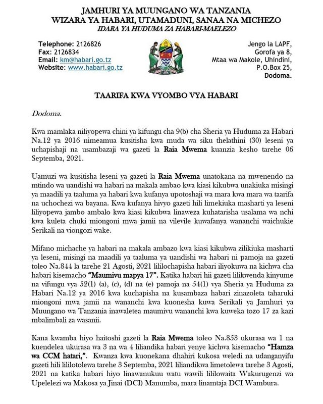 GAZETI la Rai Mwema limesitishiwa leseni ya uchapishaji na usambazaji kwa muda wa siku 30 kuanzia kesho Septemba 6, 2021