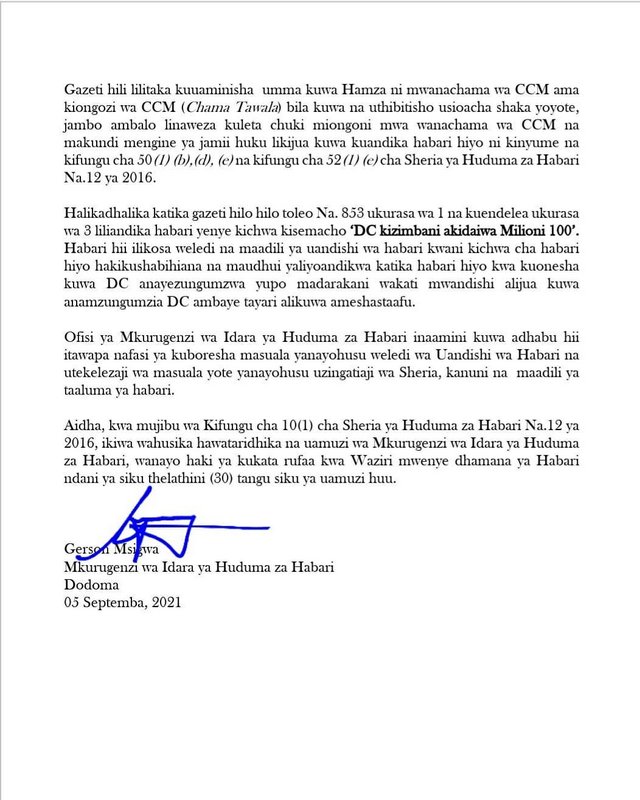 Kwa mujibu wa taarifa iliyotolewa na Mkurugenzi wa Idara ya huduma za Habari Gerson Msigwa, uamuzi unatokana mwenendo na mtindo wa uandishiwa Habari na Makala ambao kwa kiasi kikubwa unakiuka misingi ya maadili ya taaluma ya Habari kwa kufanya upotoshaji wa mara kwa mara na uchochezi.