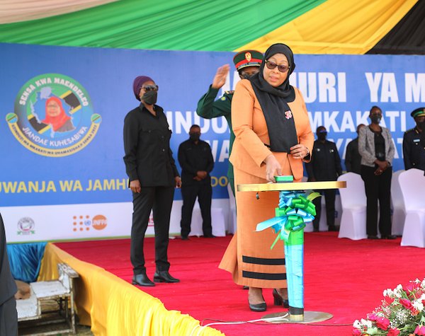Rais wa Jamhuri ya Muungano wa Tanzania Mhe. Samia Suluhu Hassan, akibonyeza kitufe kuzindua rasmi Mpango wa Uelimishaji na Uhamasishaji wa Sensa ya Watu na Makazi ya Mwaka 2022, leo Septemba 14,2021 katika Uwanja wa Jamhuri Jijini Dodoma.