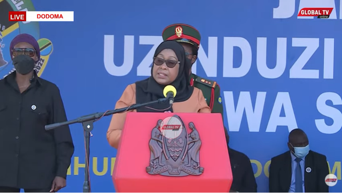 Rais wa Jamhuri ya Muungano wa Tanzania Mhe. Samia Suluhu Hassan, akilihutubia Taifa katika Hafla ya uzinduzi rasmi wa Mpango wa Uelimishaji na Uhamasishaji wa Sensa ya Watu na Makazi ya Mwaka 2022, leo Septemba 14,2021 katika Uwanja wa Jamhuri Jijini Dodoma.