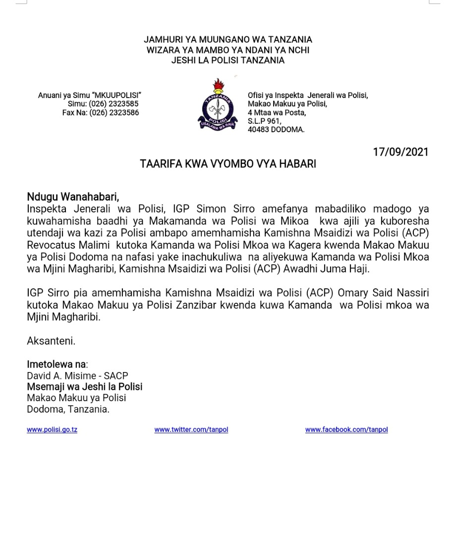 Mkuu wa Jeshi la Polisi nchini, IGP Simon Sirro amepangua baadhi ya Makamanda wa Polisi wa Mikoa na kupanga makamanda wengine.
