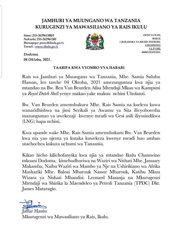 RAIS wa Jamhuri ya Muungano wa Tanzania Samia Suluhu Hassan amezungumza kwa njia ya Mtandao na Afisa Mtendaji Mkuu wa Kampuni ya Royal Dutch Shell yenye Makao Makuu yake Nchini Uholanzi Bw. Ben Van Beurden, Ikulu Chamwino Mkoani Dodoma leo tarehe 04 Octoba 2021.