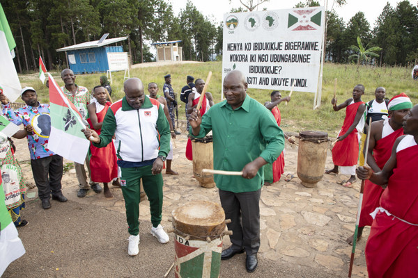 Katibu Mkuu wa Chama Cha Mapinduzi Ndugu Daniel Chongolo akipiga ngoma ya wenyeji wa Burundi mara baada ya kuwasili Mugina mkoani Makamba, Burundi.