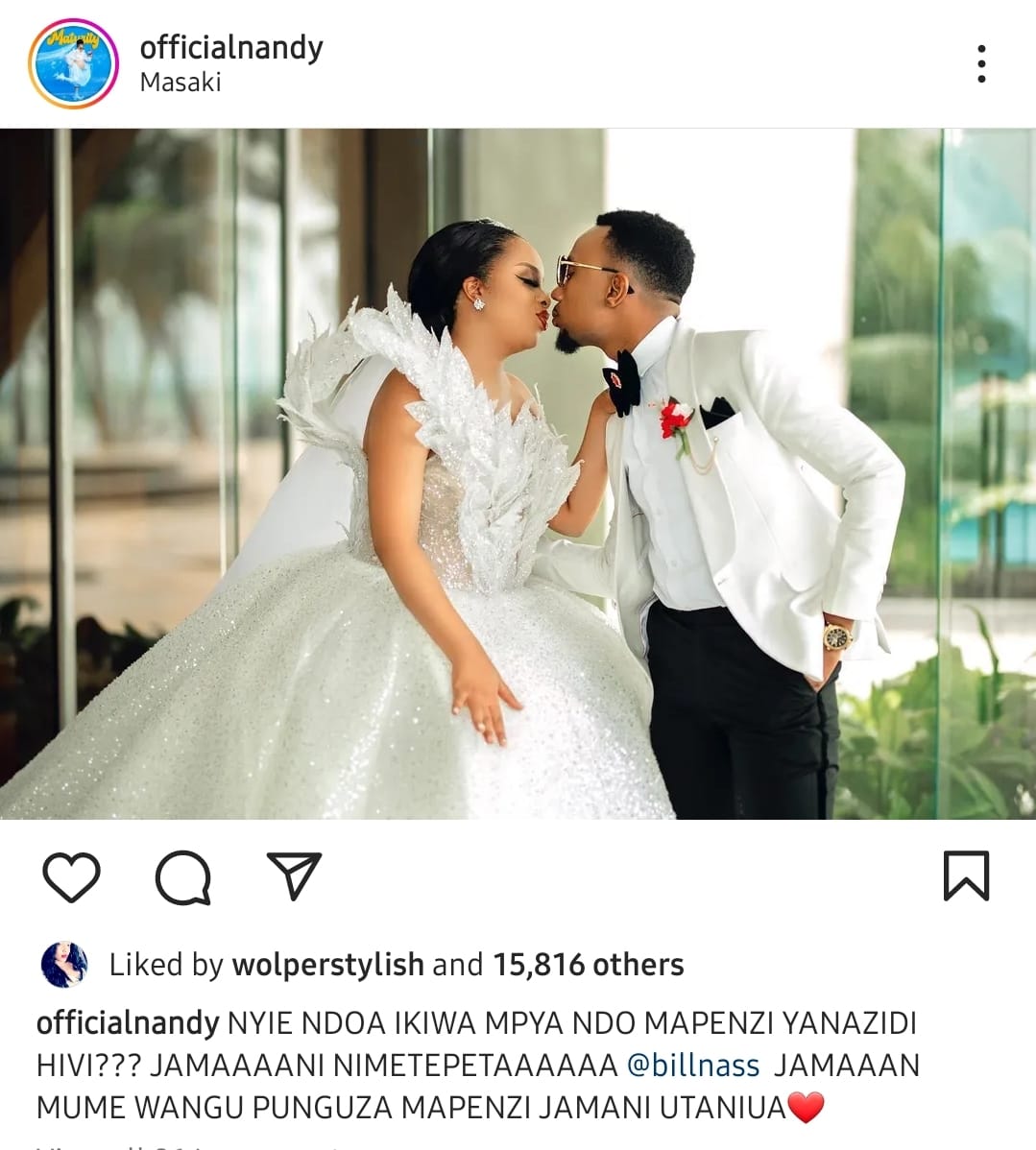 Nandy ameandika; ”Nyie ndoa ikiwa mpya ndo mapenzi yanazidi hivi??? Jamaaaani nimetepetaaaaaa @billnass jamaaan mume wangu punguza mapenzi jamani utaniua.”