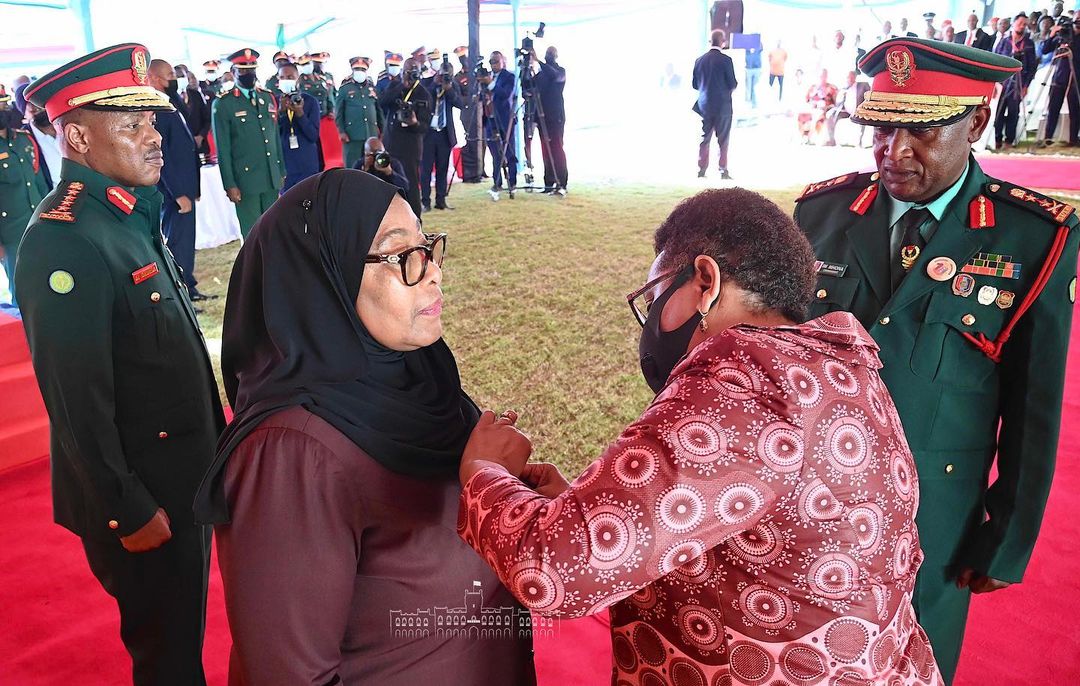 Rais  Samia  akipewa Tuzo ya Heshima ya Chuo cha Taifa cha Ulinzi Tanzania (NDC) na Waziri wa Ulinzi na Jeshi la Kujenga Taifa Dkt. Stergomena Tax.
