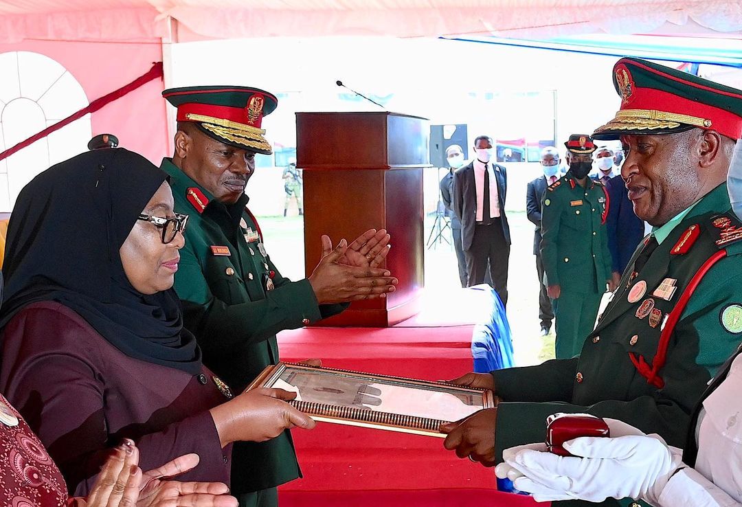Rais  Samia akikabidhiwa Cheti kama ishara ya kutunukiwa Tuzo ya Heshima ya Chuo cha Taifa cha Ulinzi Tanzania (NDC) na Mkuu wa Chuo hicho Meja Jenerali Ibrahim Michael Mhona kwenye maadhimisho ya miaka 10 ya Chuo hicho Kunduchi Jijini Dar es Salaam tarehe 08 Septemba, 2022.