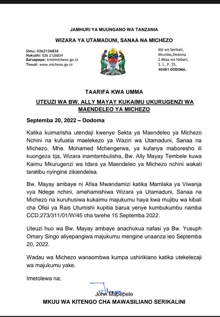 GWIJI wa Taifa Stars Ally Mayay Tembele ameteuliwa kuwa Kaimu Mkurugenzi wa Maendeleo ya Michezo nchini kwenye Wizara ya Utamaduni, Sanaa na Michezo.