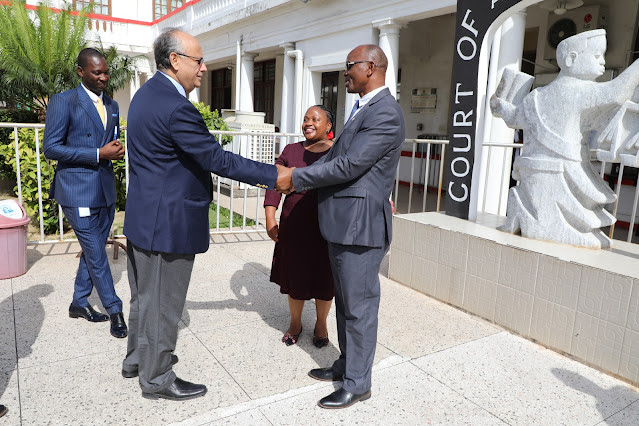 Mtendaji Mkuu wa Mahakama ya Tanzania, Prof. Elisante Ole Gabriel (kulia) akisalimiana na Mkurugenzi wa Kanda ya Afrika anayeshughulikia Ukuzaji wa Uchumi na Taasisi kutoka Benki ya Dunia (WB), Bw. Asad Alam alipowasili katika Ofisi ya Mtendaji huyo  iliyopo Mahakama ya Rufani jijini Dar es Salaam. Mkurugenzi huyo amefanya ziara fupi ya kutembelea Mahakama.