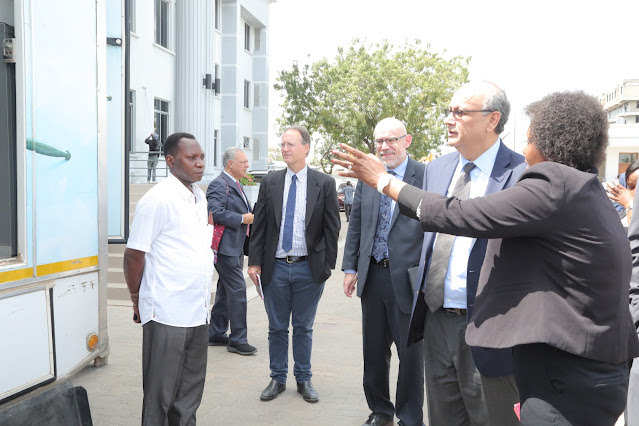 Msajili wa Mahakama Kuu ya Tanzania, Mhe. Sharmillah Sarwatt (aliyenyoosha mkono) akimuonesha Bw. Alam (aliyesimama wa kwanza kulia kwa Msajili) gari maalum la Mahakama inayotembea alipotembelea Mahakama Kuu-Kituo Maalum cha Masuala ya Familia kilichopo Temeke jijini Dar es Salaam.