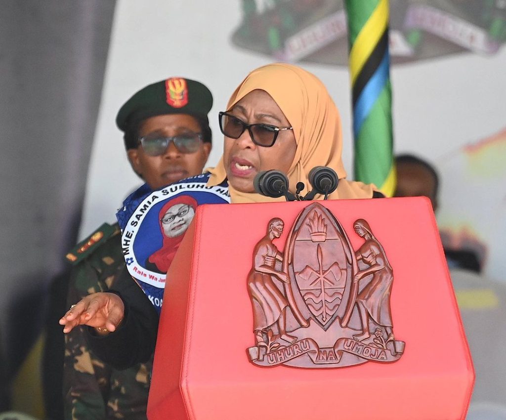 Rais wa Jamhuri ya Muungano wa Tanzania, Samia Suluhu Hassan akizungumza na viongozi mbalimbali pamoja na Wananchi wa Mkoa wa Kagera katika Maadhimisho ya Kilele cha mbio za Mwenge wa Uhuru ambayo yamefanyika kwenye uwanja wa Kaitaba, Bukoba Mkoani Kagera tarehe 14 Oktoba, 2022.