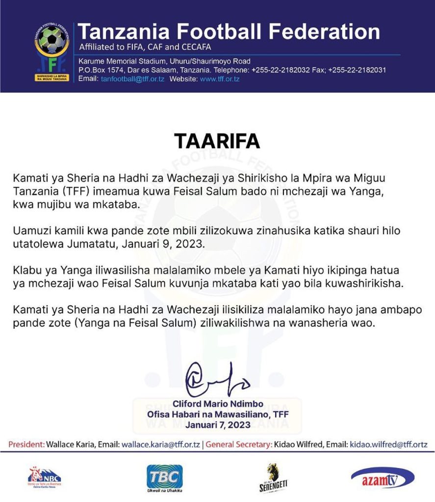 Katika taarifa yake iliyotolewa leo, Januari 7, 2023 na kusainiwa na Cliford Ndimbo, Ofisa Habari na Mawasiliano wa TFF, uamuzi kamili wa pande zote mbili zilizokuwa zinahusika kwenye shauri hilo, utatolewa Jumatatu, Januari 9, 2023.