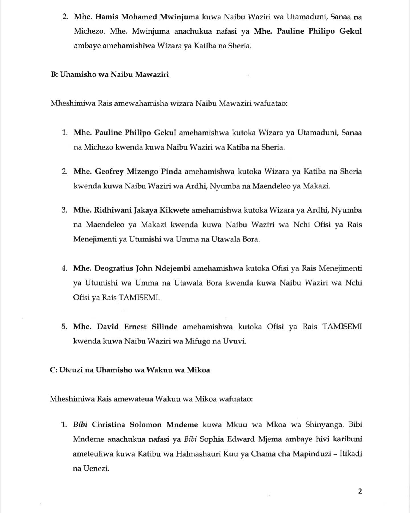 Hata hivyo aliyekuwa Mkuu wa Mkoa wa Songwe, Waziri Kindamba amehamishiwa Mkoa wa Tanga, huku aliyekuwa mkuu wa mkoa huo, Omary Mgumba uteuzi wake ukitenguliwa.