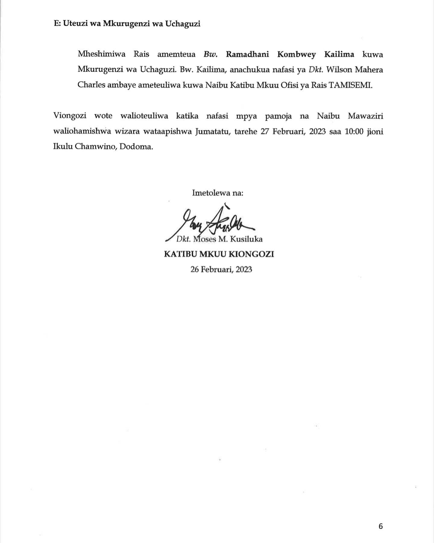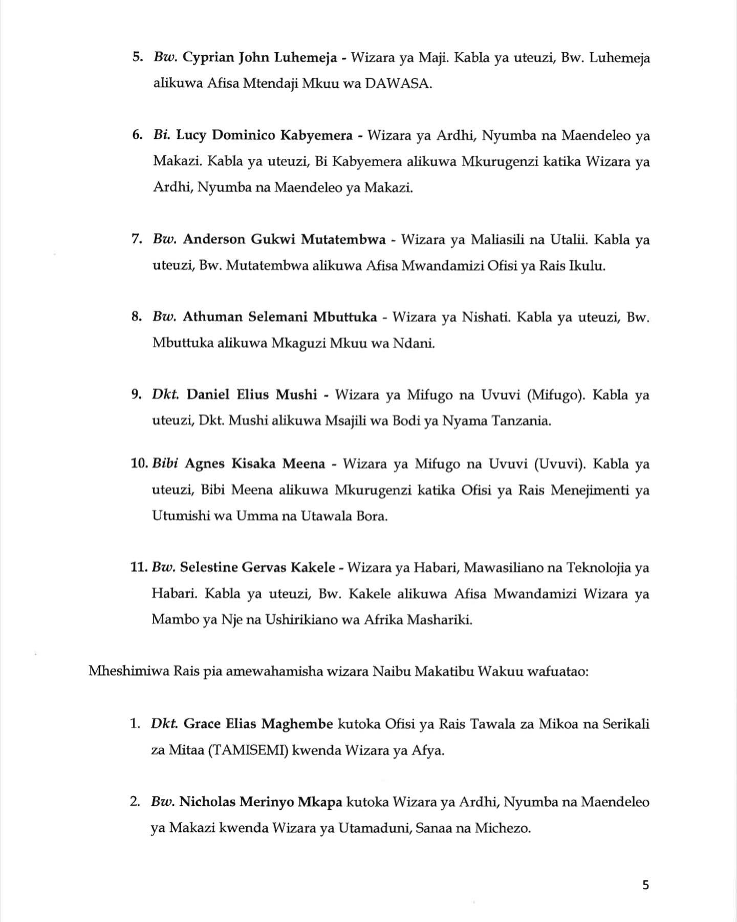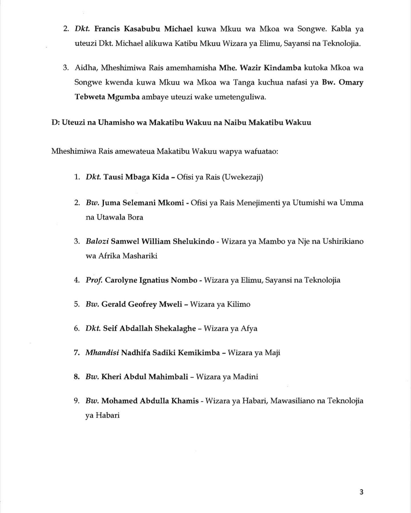 Aidha Katibu Mkuu Wizara ya Elimu, Sayansi na Teknolojia, Francis Michael nae ameteuliwa kuwa Mkuu wa Mkoa wa Songwe,