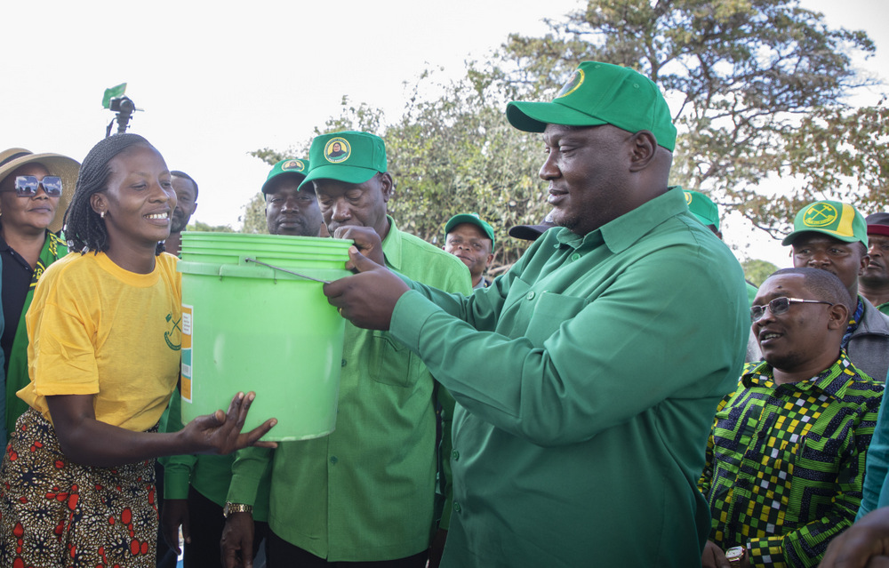 Katibu Mkuu wa Chama Cha Mapinduzi Ndugu Daniel Chongolo akimtwisha ndoo ya maji Bi,Rosemary Zakaria Madulu (kushoto) mara baada ya kutembelea  mradi wa maji Isimani Kilolo wenye thamani ya bilioni 9.2 ambao utahudumia vijiji 29 katika Kijiji cha Chamdindi, Jimbo la Isimani mkoani Iringa.