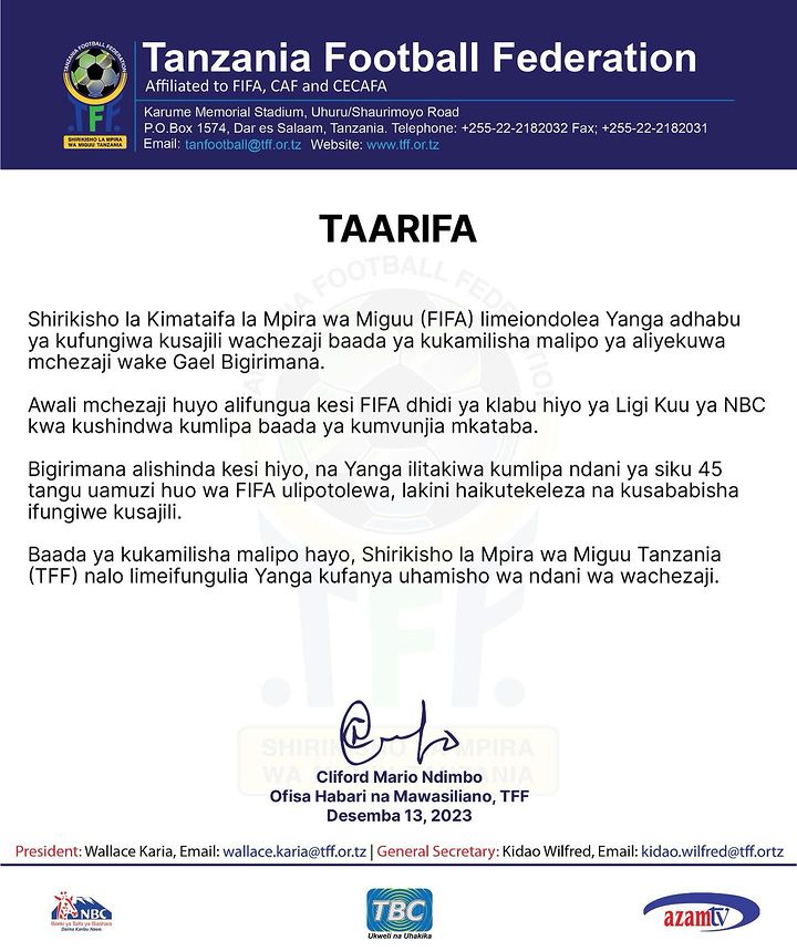 Klabu ya Yanga ilifungiwa usajili na FIFA baada ya kushindwa kumlipa mchezaji huyo ndani ya siku 45 ambao ulikuwa uamuzi wa FIFA baada ya Bigirimana kushinda kesi yake dhidi ya Yanga