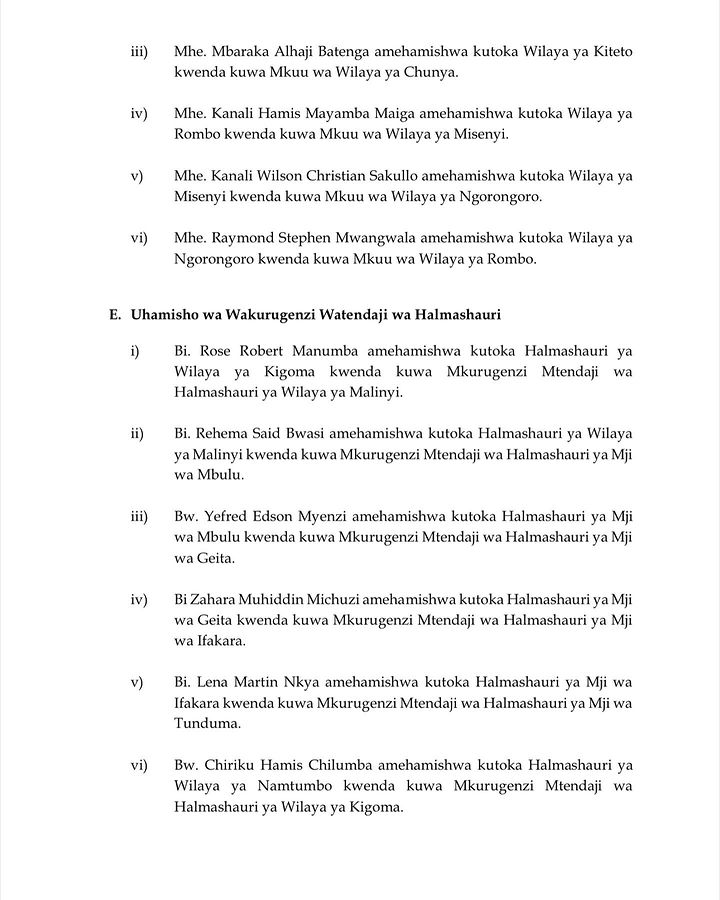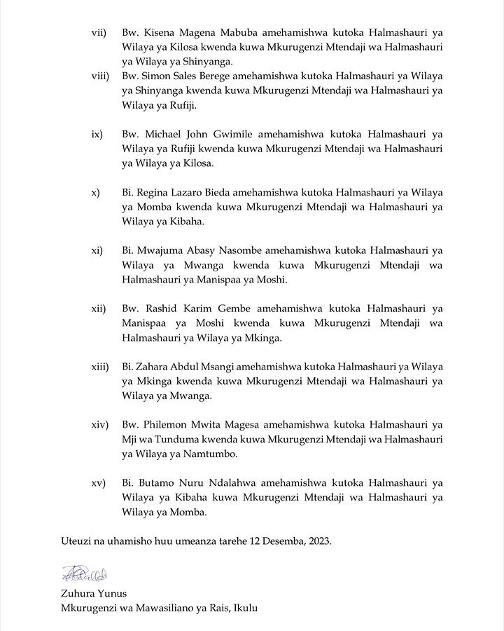 Rais wa Jamhuri ya Muungano wa Tanzania, Samia Suluhu Hassan Desemba 14, 2023 ameteua na kufanya mabadiliko ya uteuzi kwa Wakuu wa Wilaya, Wakurugenzi wa Halmashauri, Makatibu Tawala kama ifatavyo:-