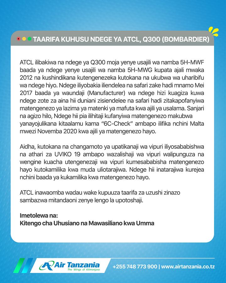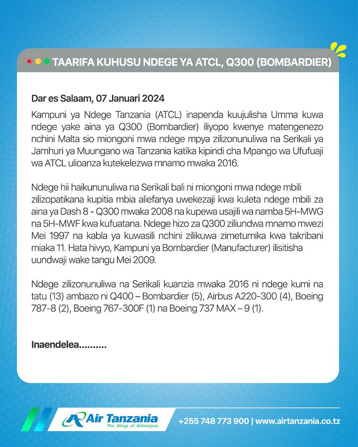 Kampuni ya Ndege Tanzania (ATCL) imeujulisha Umma kuwa ndege yake aina ya Q300 (Bombardier) iliyopo kwenye matengenezo nchini Malta sio miongoni mwa ndege mpya zilizonunuliwa na Serikali ya Jamhuri ya Muungano wa Tanzania katika kipindi cha Mpango wa Ufufuaji wa ATCL ulioanza kutekelezwa mnamo mwaka 2016.