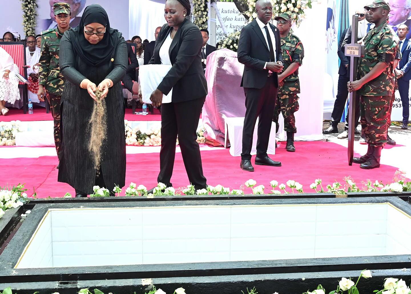 Rais wa Jamhuri ya Muungano wa Tanzania, Samia Suluhu Hassan akiweka udongo kwenye kaburi la Waziri Mkuu Mstaafu Hayati Edward Ngoyai Lowassa Monduli Mkoani Arusha tarehe 17 Februari, 2024.