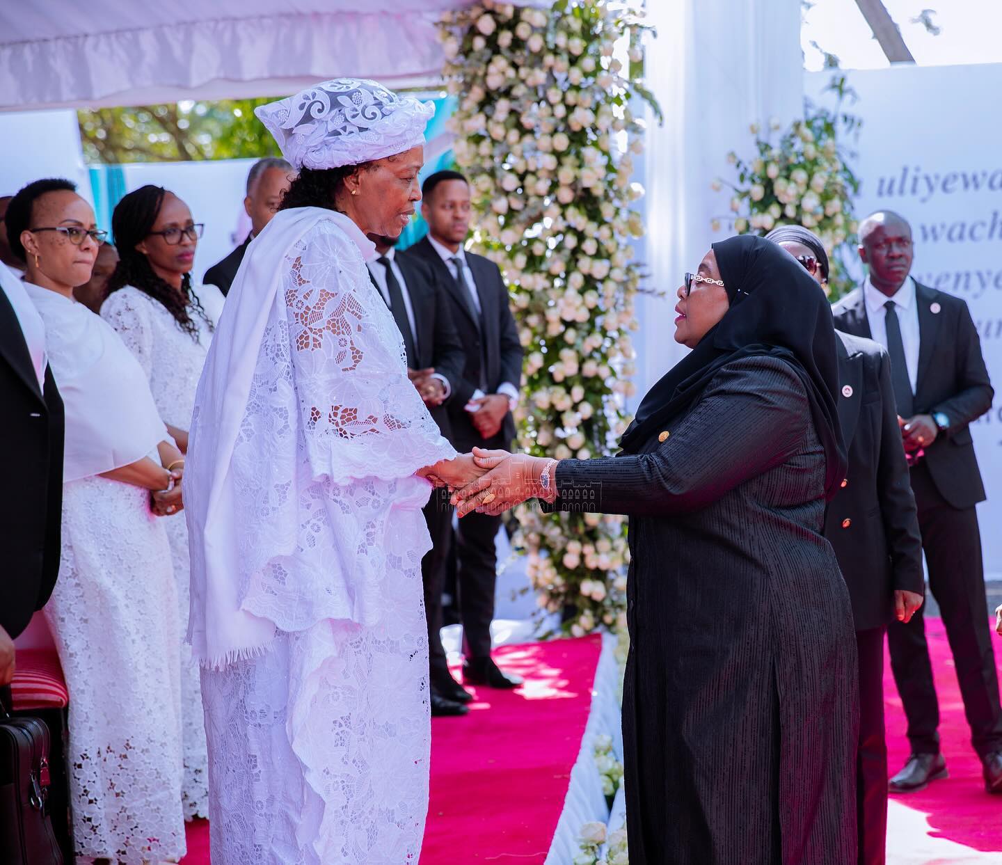 Rais Samia akizungumza na Viongozi mbalimbali pamoja na Waombolezaji wakati wa Shughuli za Mazishi ya Waziri Mkuu Mstaafu Edward Ngoyai Lowassa katika Kijiji cha Ngarash, Monduli Mkoani Arusha tarehe 17 Februari, 2024.Rais wa Jamhuri ya Muungano wa Tanzania Mhe. Samia Suluhu Hassan akimfariji Mama Regina Lowassa Mjane wa Waziri Mkuu Mstaafu Hayati Edward Ngoyai Lowassa mara baada ya shuguli za Mazishi zilizofanyika Nyumbani kwa Marehemu Ngarash, Monduli Mkoani Arusha tarehe 17 Februari, 2024.