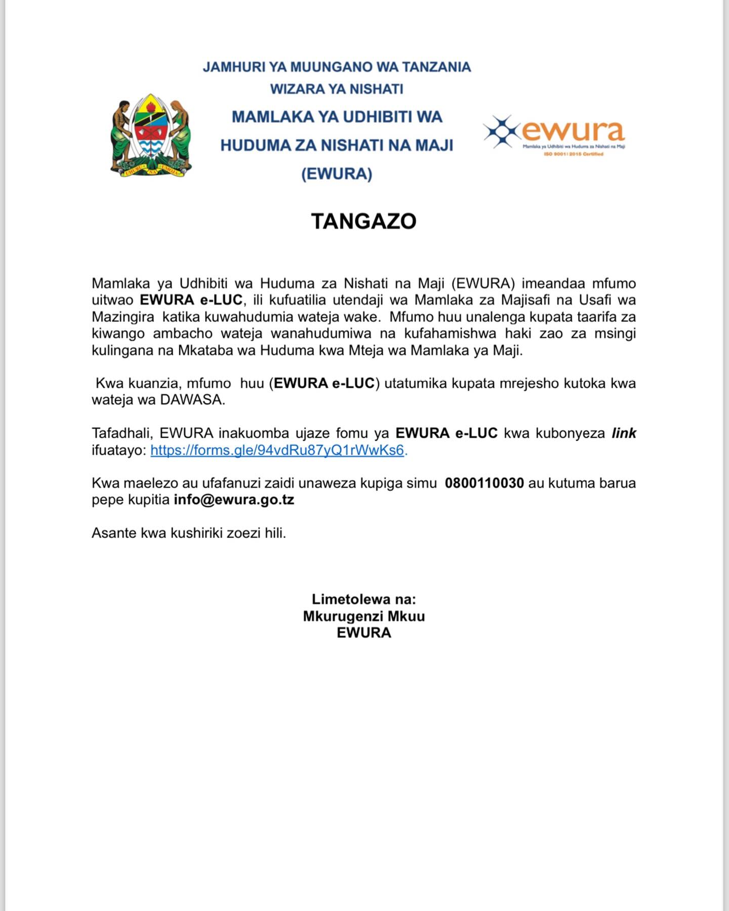 Tafadhali, EWURA inakuomba ujaze fomu ya EWURA e-LUC kwa kubonyeza link ifuatayo: https://forms.gle/94vdRu87yQ1rWwKs6.