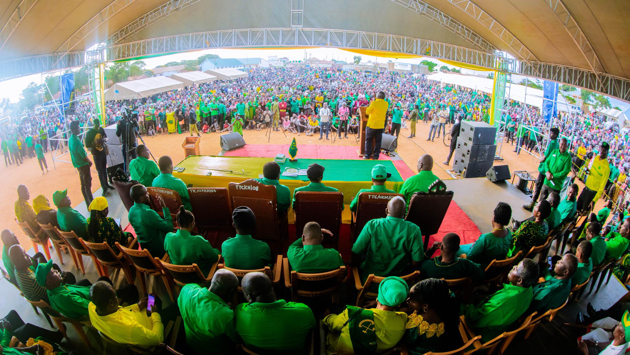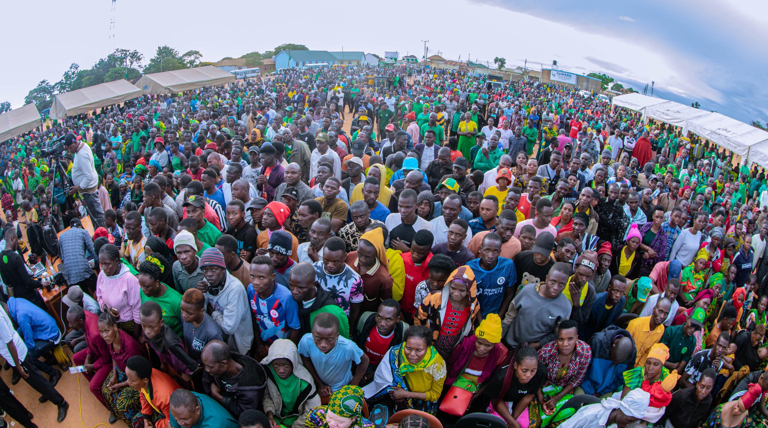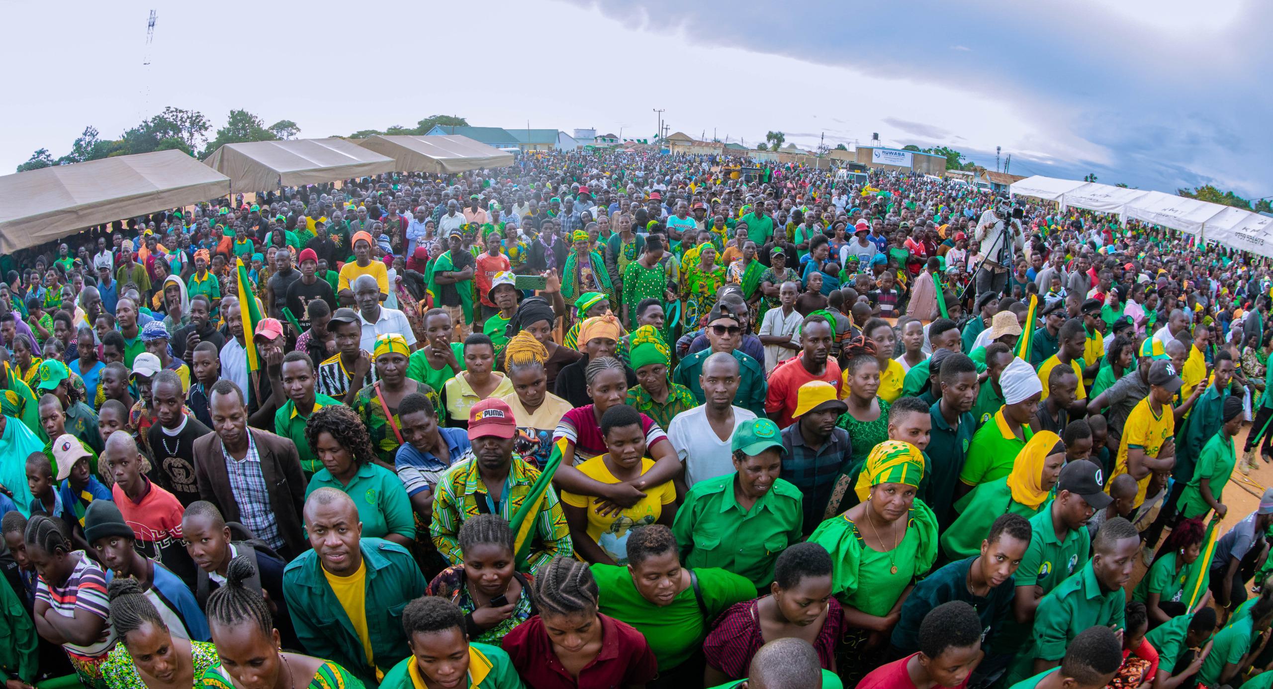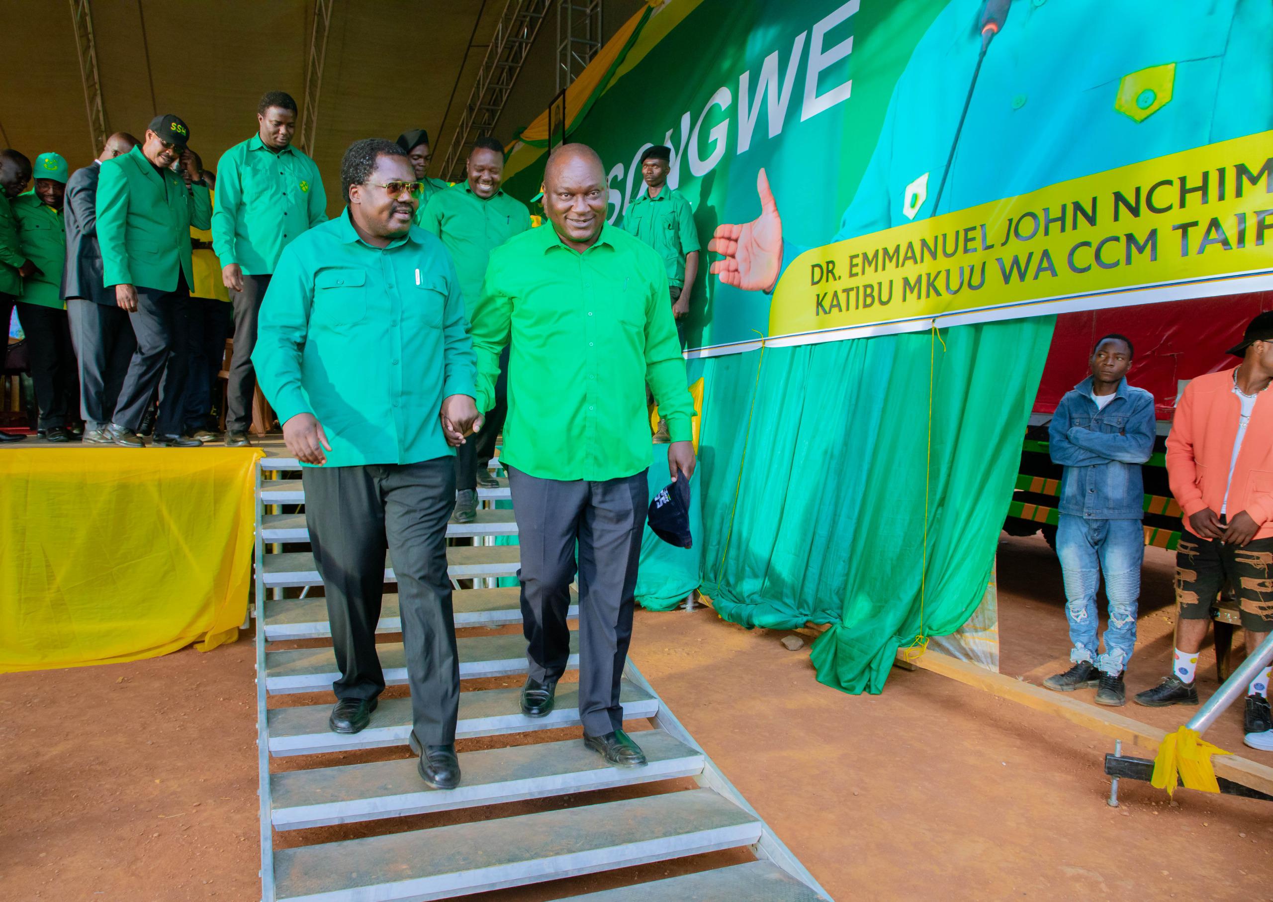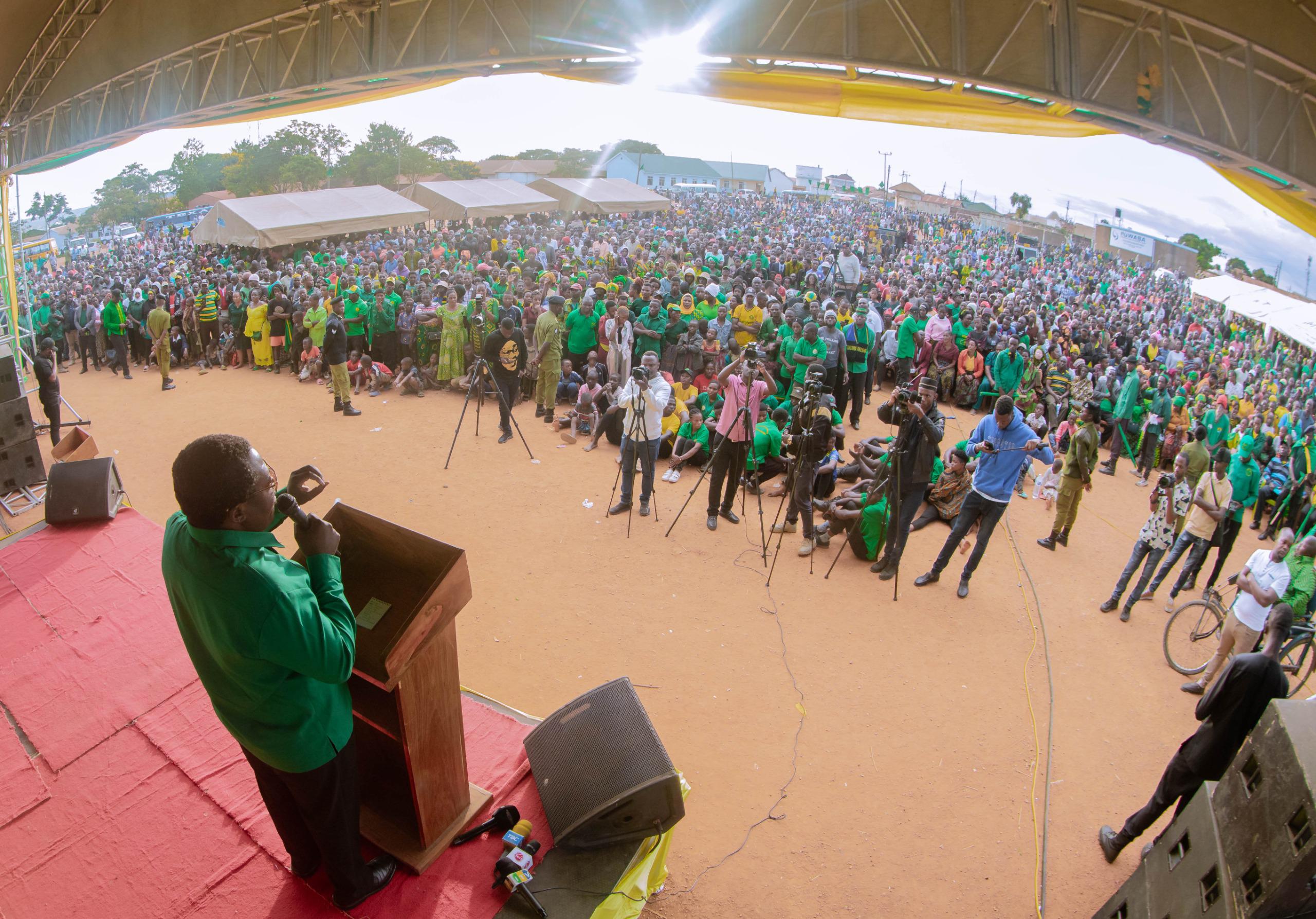Katibu Mkuu wa Chama Cha Mapinduzi (CCM), Balozi Dk Emmanuel John Nchimbi akihutubia maelfu ya wananchi katika mkutano mkubwa wa hadhara uliofanyika katika Mji wa Tunduma, Wilaya ya Mbozi, mkoani Songwe, leo Jumatatu, Aprili 15, 2024, akiambatana na Wajumbe wa Sekreterieti ya Halmashauri Kuu ya CCM (NEC) Taifa, Ndugu Issa Haji Usi Gavu, Katibu wa NEC – Oganaizesheni na Ndugu Amos Gabriel Makala, Katibu wa NEC – Itikadi, Uenezi na Mafunzo. Balozi Dk Nchimbi ameingia mkoani Songwe kwa ziara ya siku mbili, tarehe 15 na 16, Aprili, 2024, akitokea Mkoa wa Rukwa, ikiwa ni mwendelezo wa ziara yake katika mikoa 6 ya Katavi, Rukwa, Songwe, Mbeya, Njombe na Ruvuma.