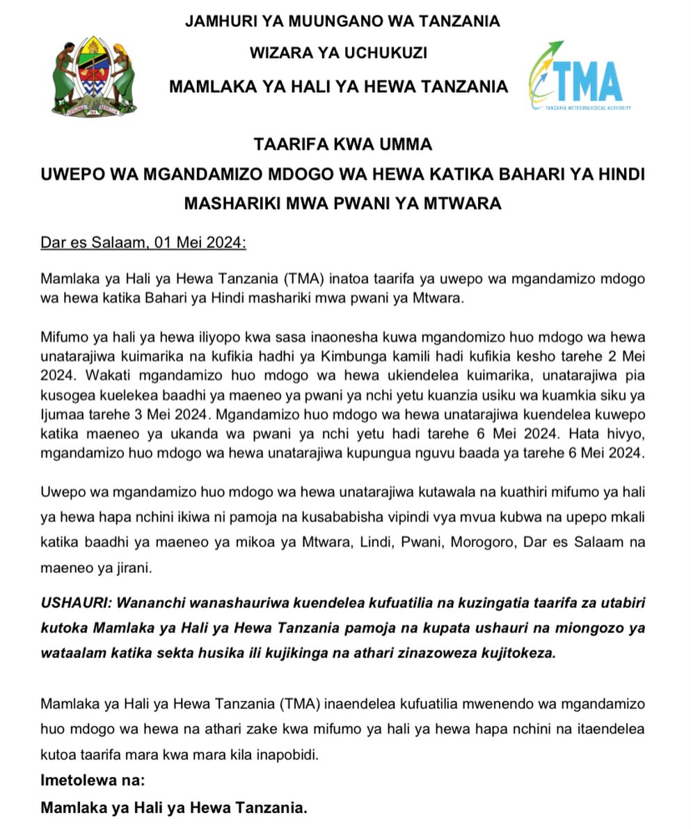 ‘’Hali hiyo inatarajiwa kusogea na kuelekea baadhi ya maeneo ya pwani ya nchi yetu kuanzia usiku wa kuamkia siku ya Ijumaa tarehe 3 mwezi Mei 2024’’, ilisema TMA katika taarifa kwa vyombo vya habari.