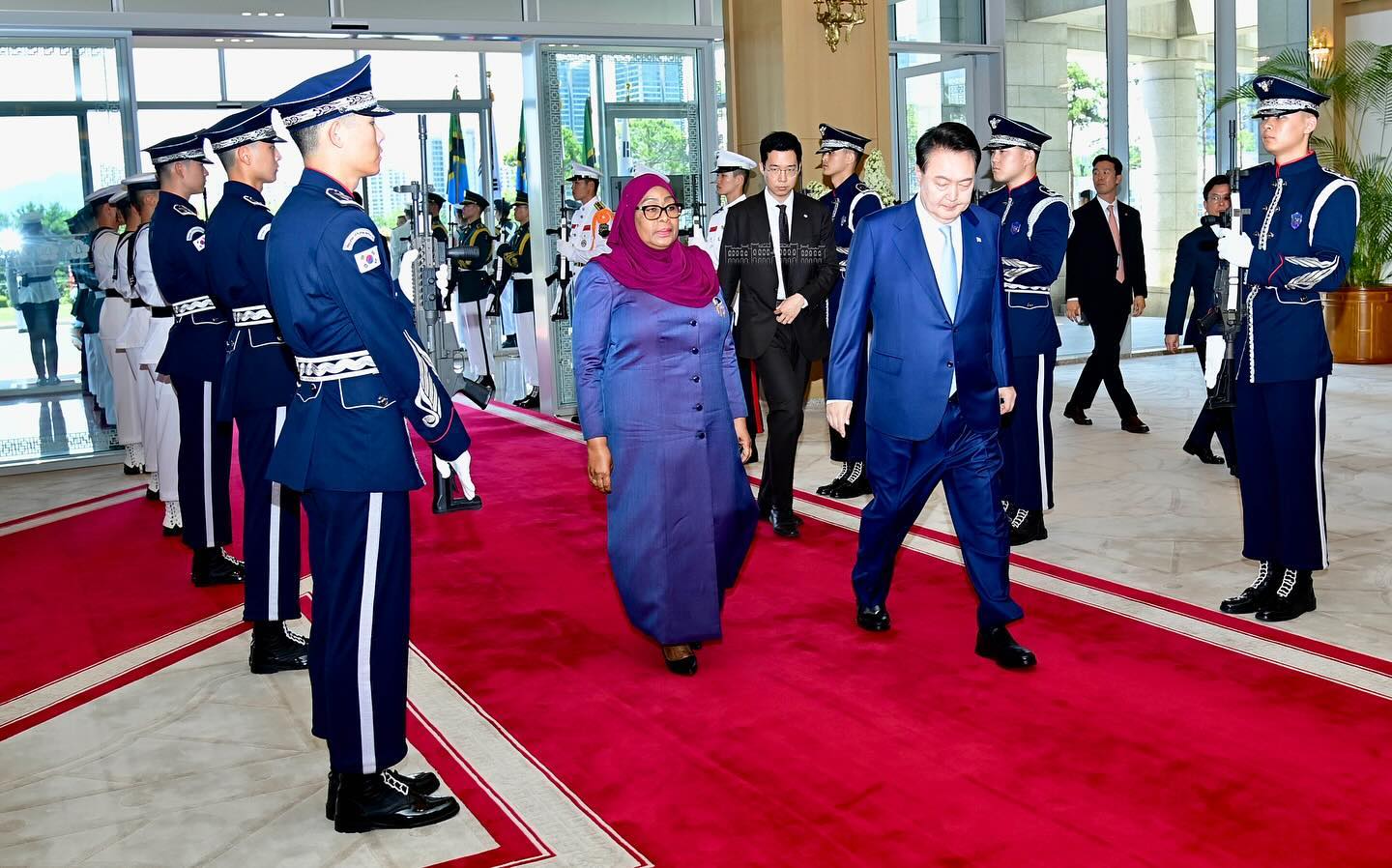 Rais Samiaakiwa na Mwenyeji wake Rais wa Jamhuri ya Korea, Yoon Suk Yeol wakati wakishuhudia Waziri wa Viwanda na Biashara Dkt. Ashatu Kijaji pamoja na Waziri wa Biashara wa Korea Inkyo Cheong wakisaini Tamko la Pamoja kuhusu Uanzishwaji wa Majadiliano juu ya Mkataba wa Ushirikiano Kiuchumi. Shamrashamra za Mapokezi ya Rais Samia atika Ikulu ya Nchi ya Jamhuri ya Korea Jijini Seoul.Rais Samia akiongoza ujumbe wa Tanzania kwenye mazungumzo Rasmi na Rais wa Jamhuri ya Korea, Yoon Suk Yeol.Rais Samia akiwa kwenye picha ya pamoja na Mwenyeji wake Rais wa Jamhuri ya Korea Yoon Suk Yeol kabla ya kushuhudia hafla ya utiaji saini Mikataba mbalimbali.Rais Samia akiwa na Mwenyeji wake Rais wa Jamhuri ya Korea, Yoon Suk Yeol mara baada ya kuwasili katika Ikulu ya Nchi hiyo.